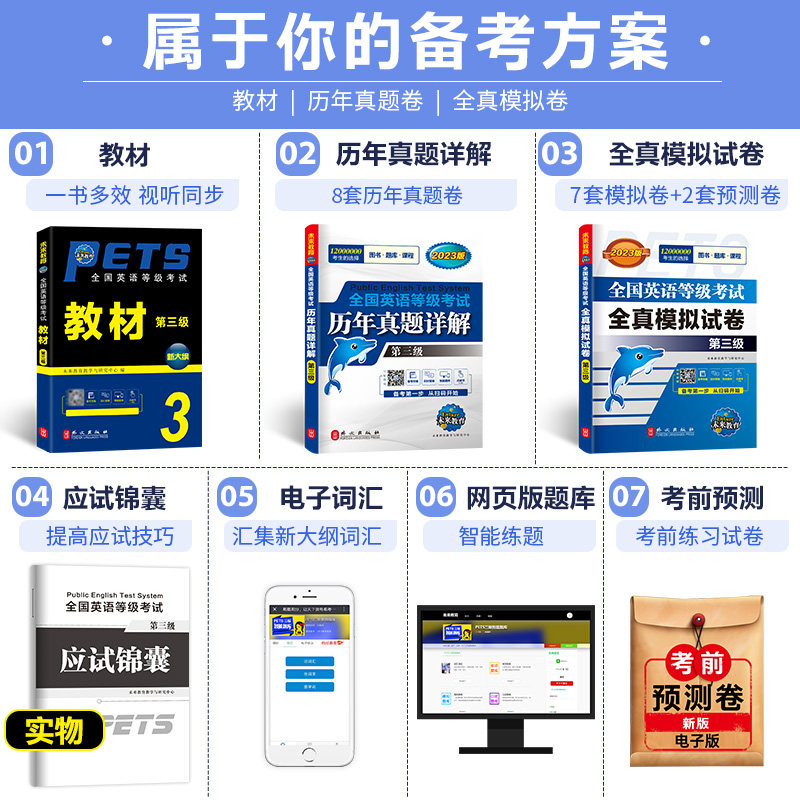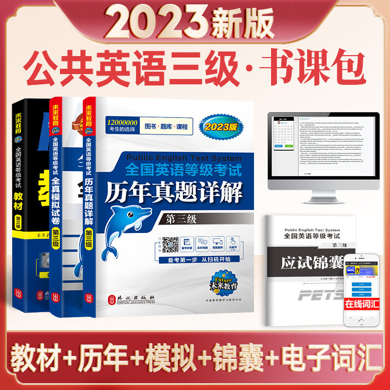 📚 未来教育2024年公共英语三级教材历年真题全真模拟试卷全国英语等级考试第三级词汇口语法听力红宝书题库网课视频过代报名pets3