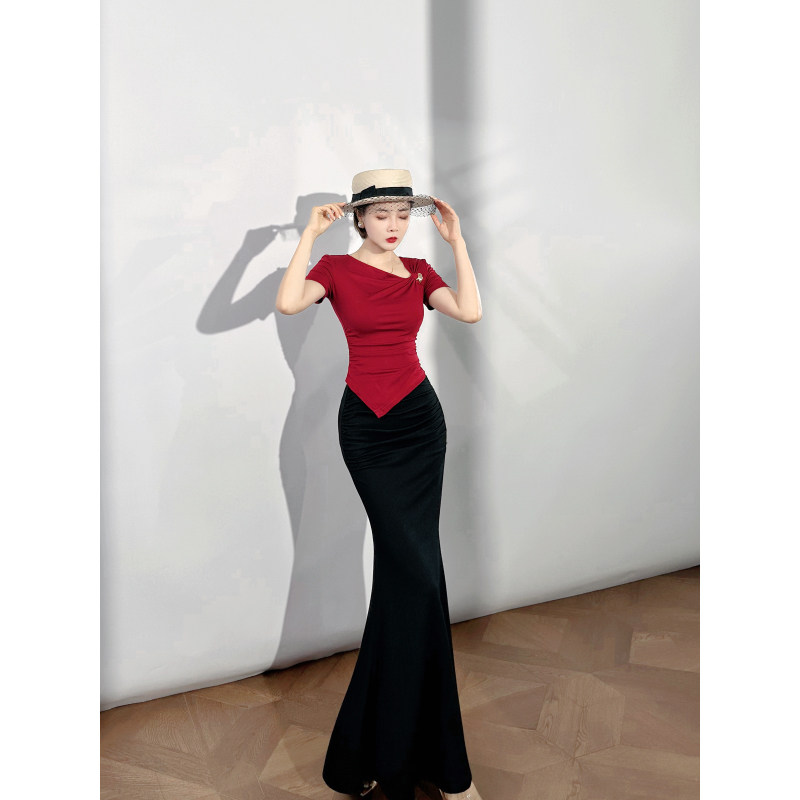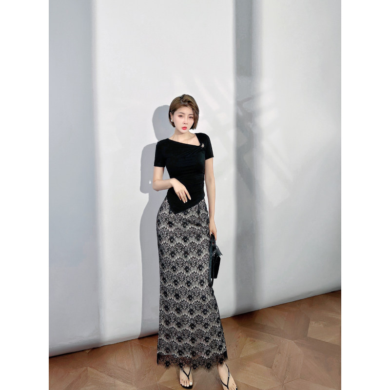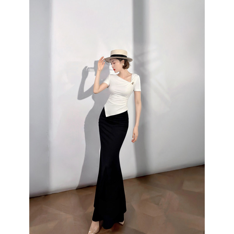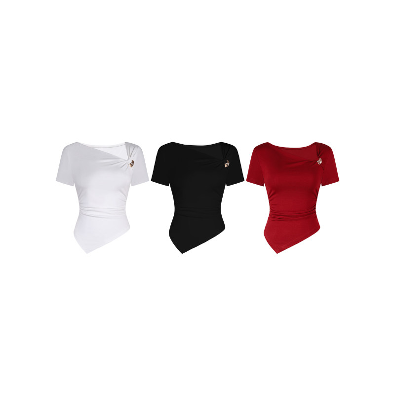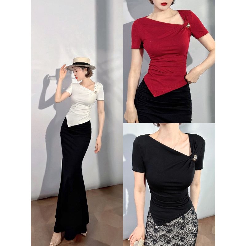 📚 XULU原创夏季轻薄透气亲肤棉时尚不规则斜肩短袖T收腰短款上衣