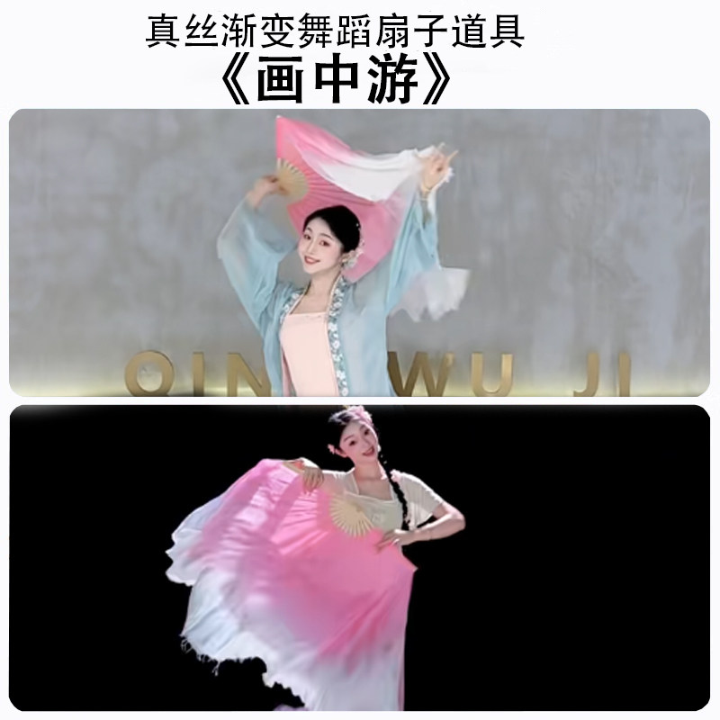 📚 扇子舞蹈扇画中游刘宇同款真丝双面藕粉渐变色扇子古典舞秧歌扇子