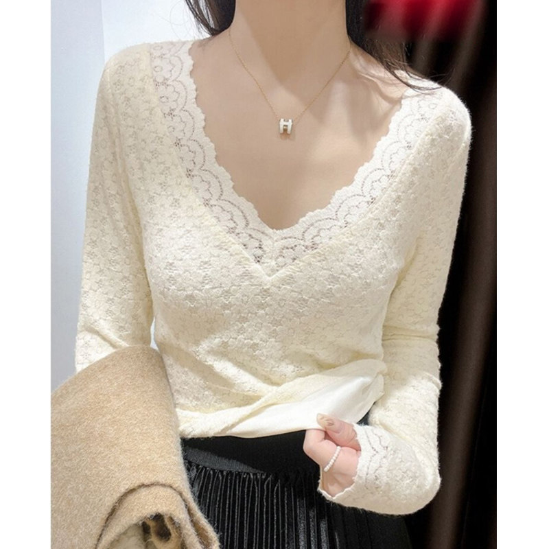 📚 加绒加厚蕾丝V领打底衫女春秋洋气时尚内搭毛衣性感低领网纱上衣