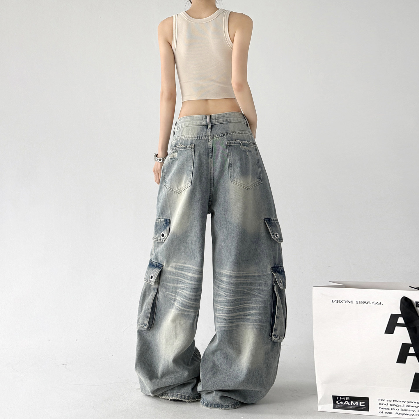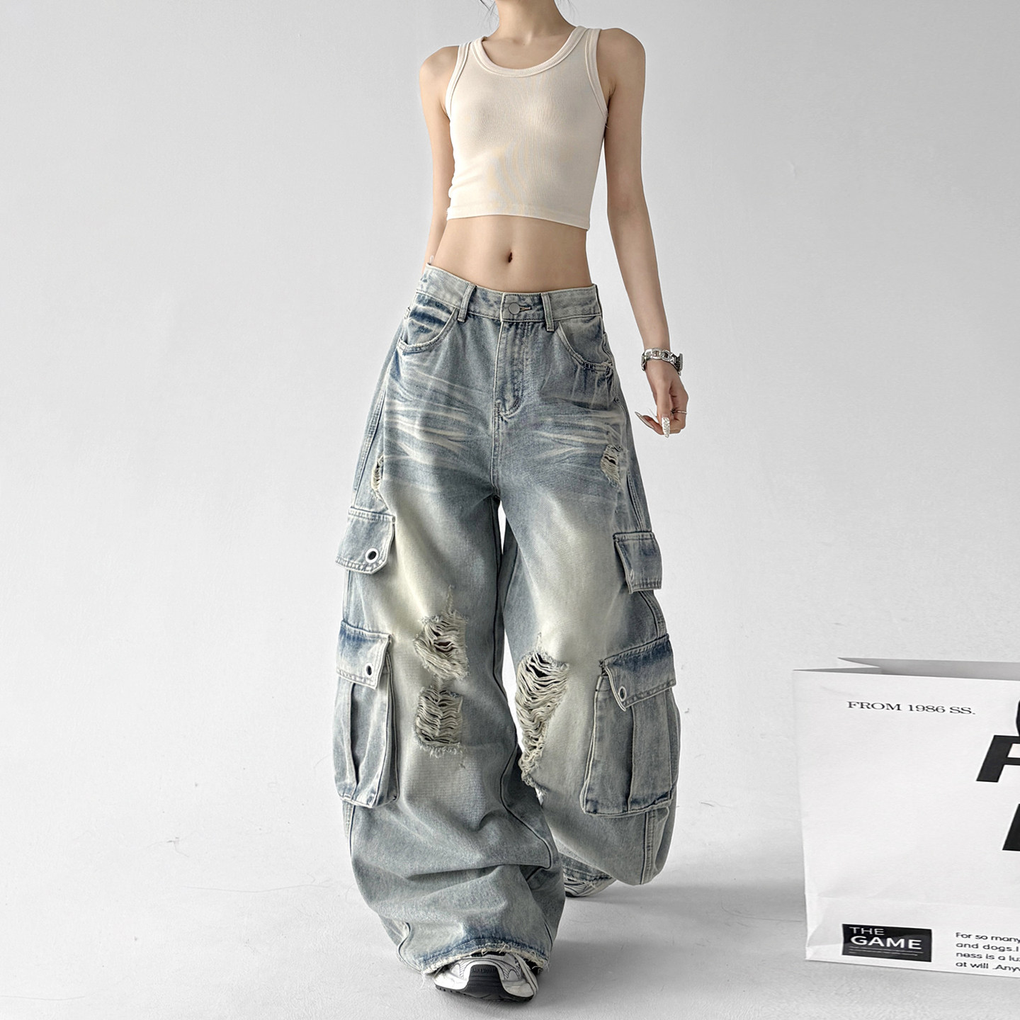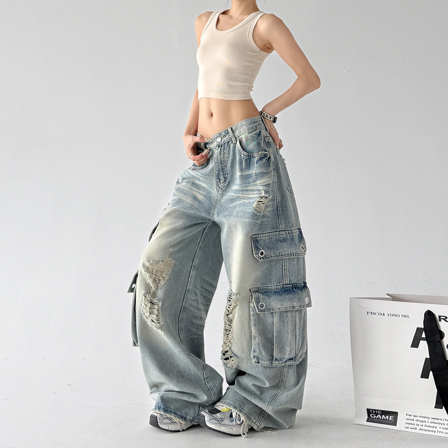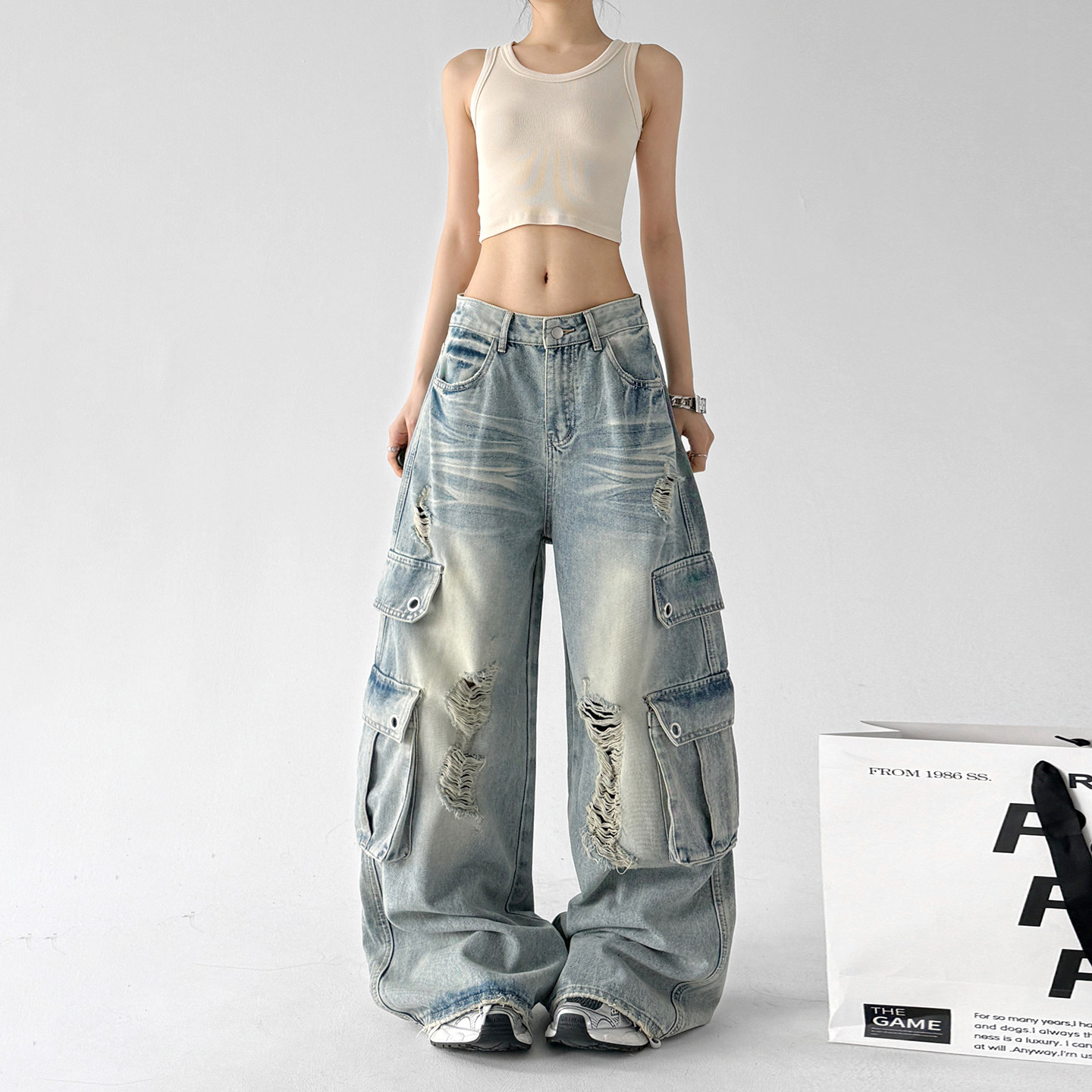 📚 复古工装风阔腿牛仔裤女2026夏装新款高个破洞多口袋宽松显瘦长裤