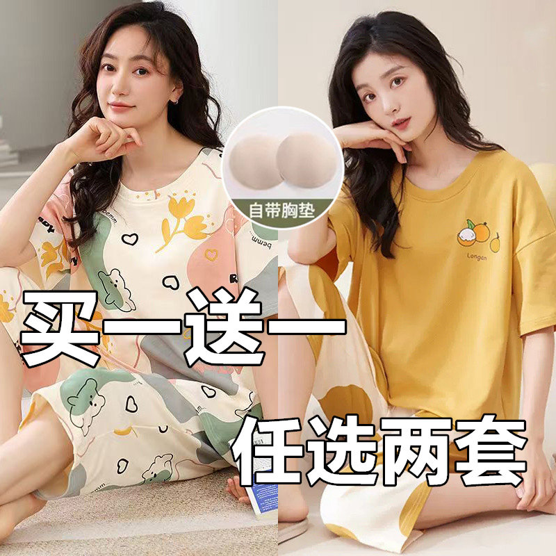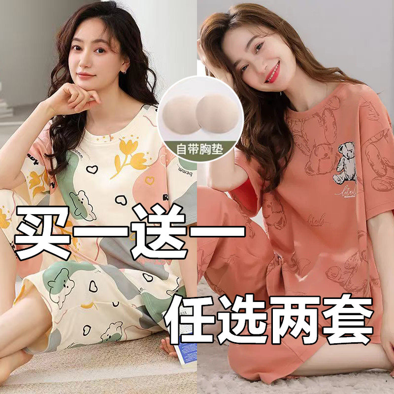 📚 睡衣女士夏季带胸垫短袖七分裤加大码宽松薄款凉感家居服两件套