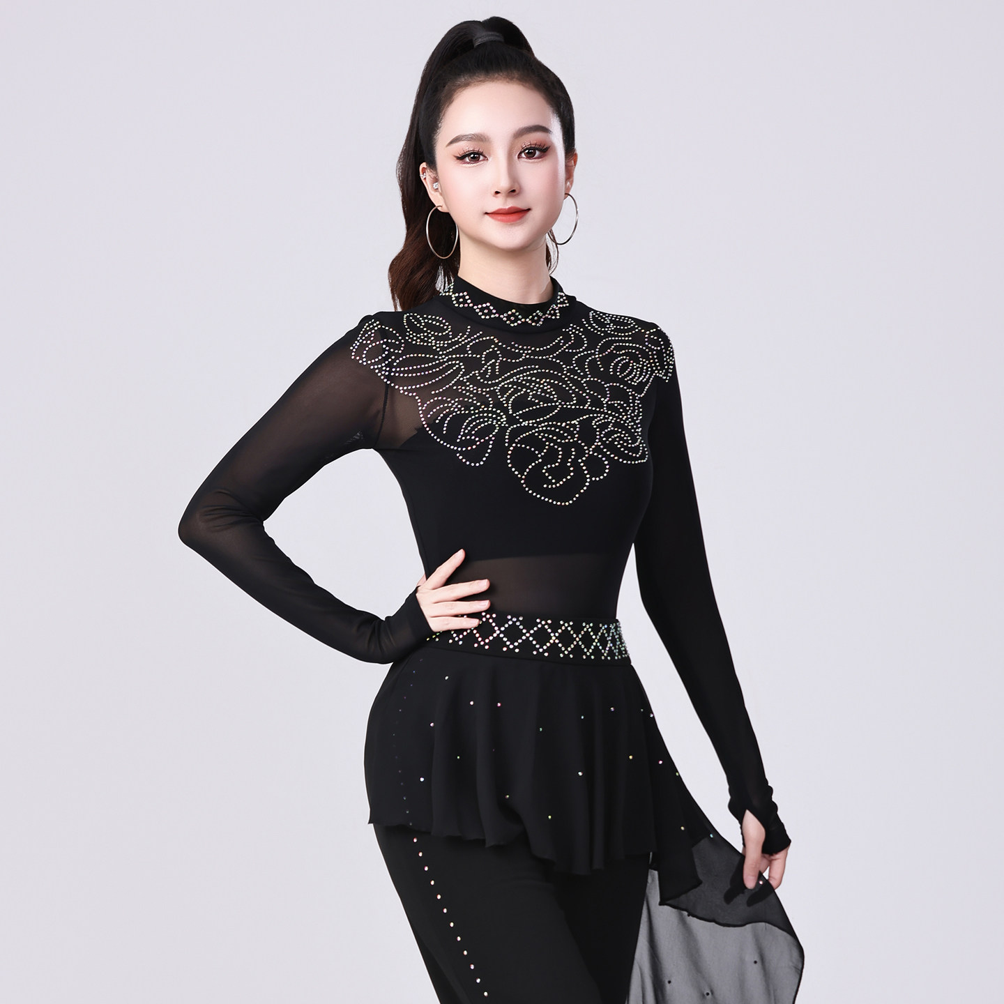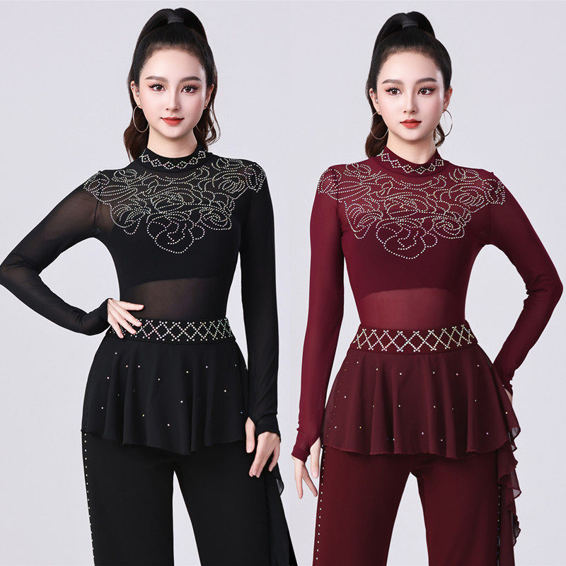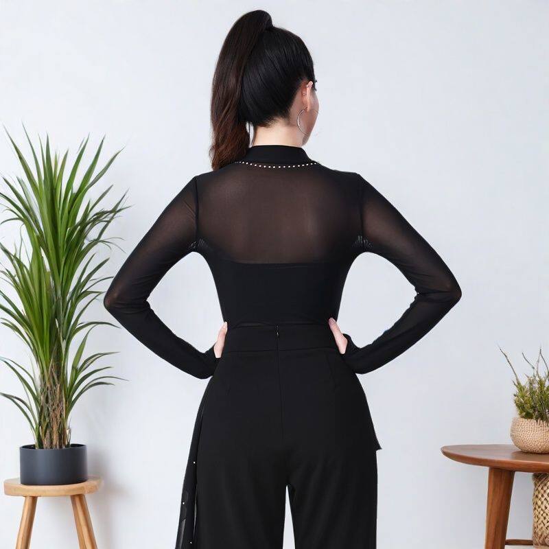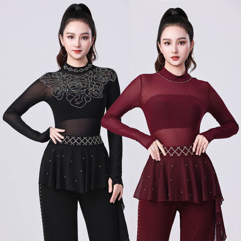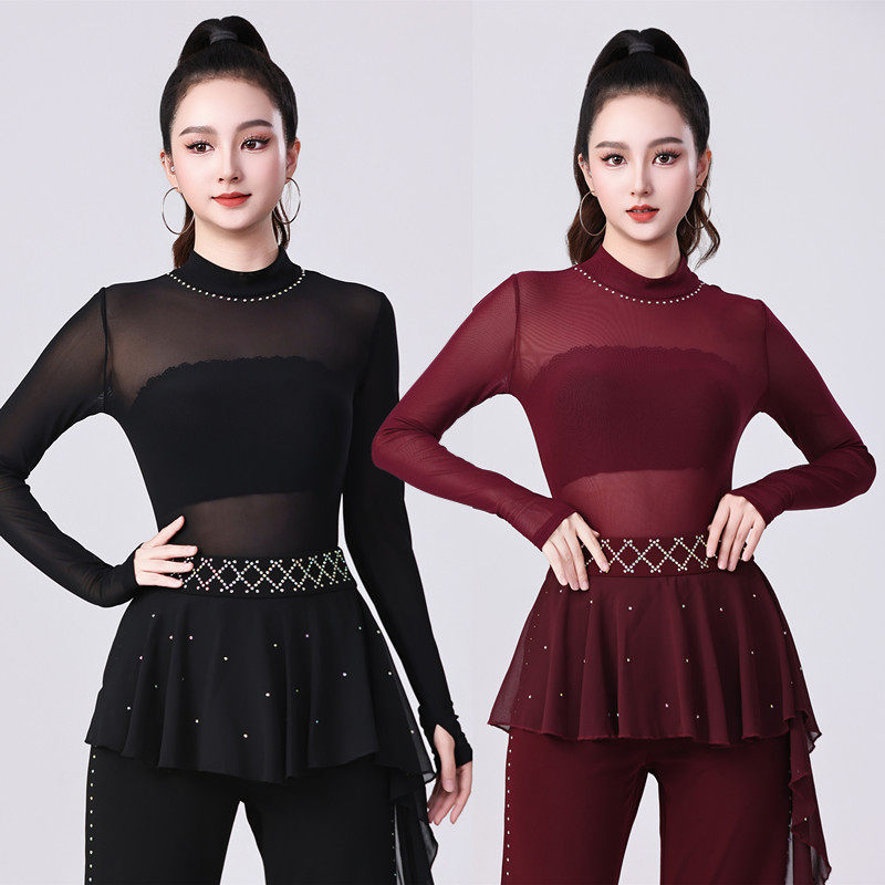 📚 拉丁舞上衣女三步踩烫钻吉特巴半高领性感网纱透视连档广场舞蹈衣