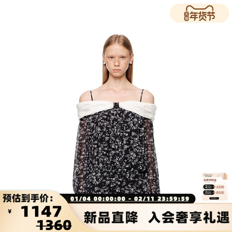 📚 SHRO ENRO女士佩拉斯特海滩黑白花卉撞色一字肩连衣裙银泰301469