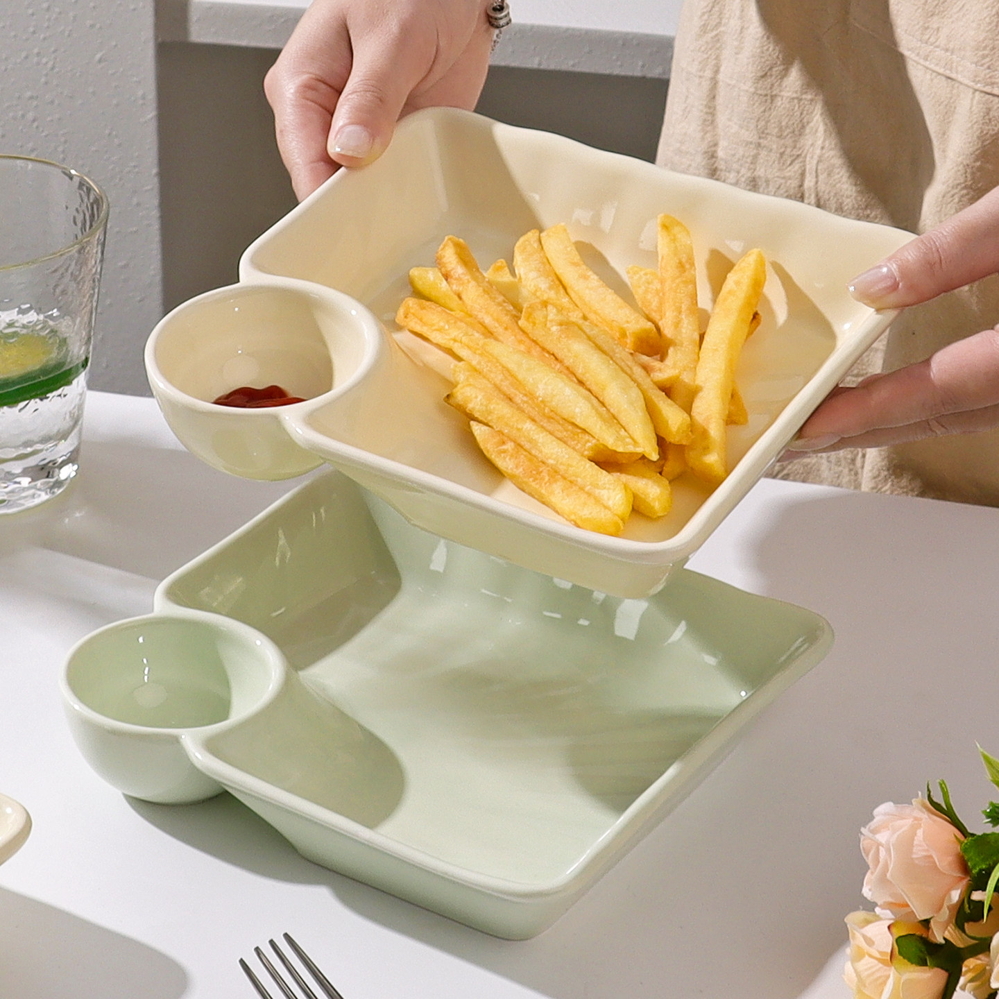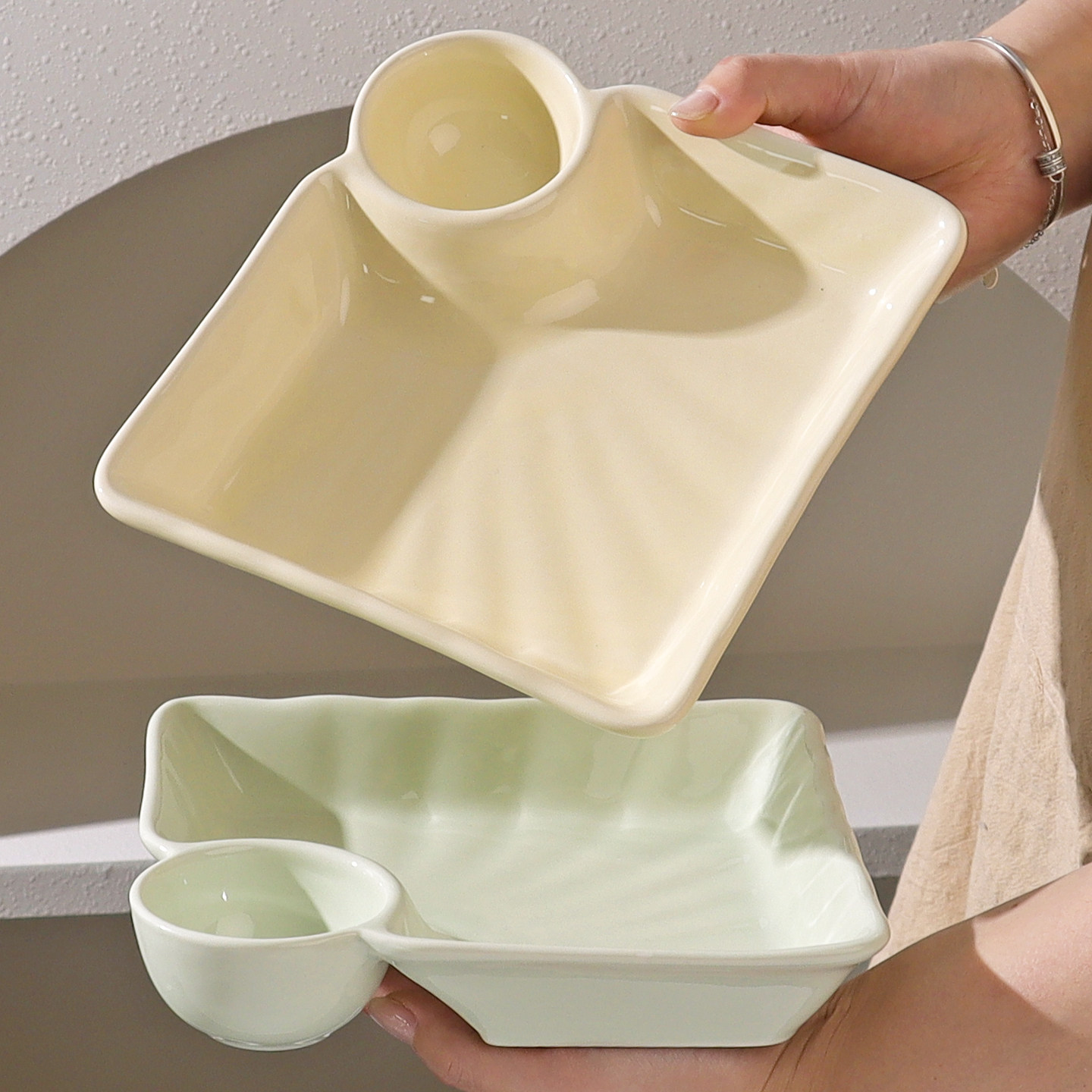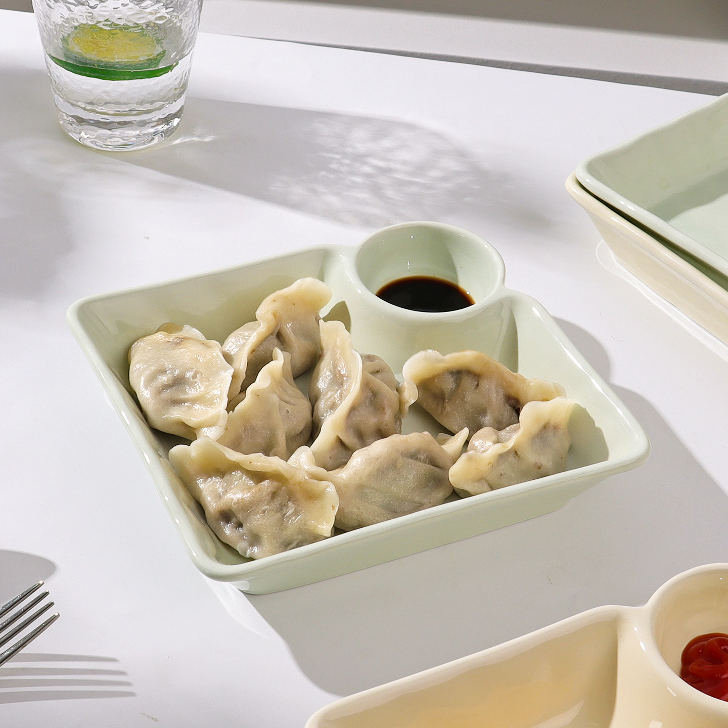 📚 怀瑾饺子盘家用2026新款奶油风陶瓷饺子盘吃水饺专用带醋碟餐具