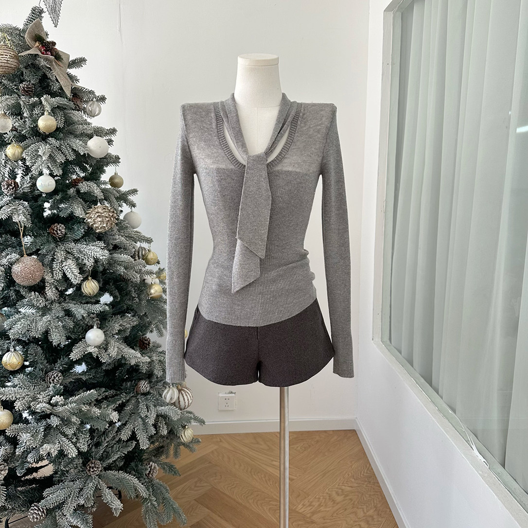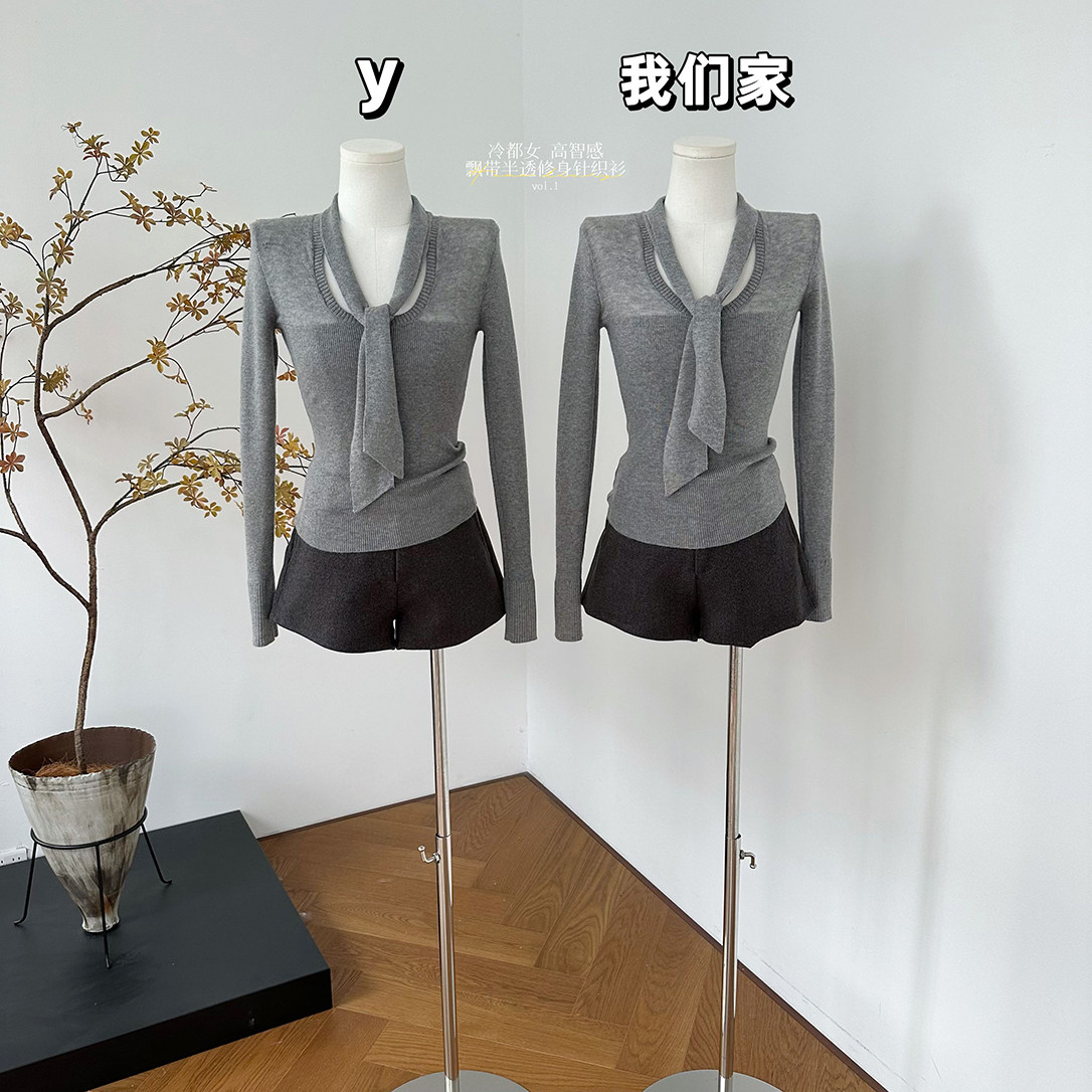 📚 柒月末 冷都女 高智感飘带半透修身针织衫女秋冬长袖内搭T恤上衣
