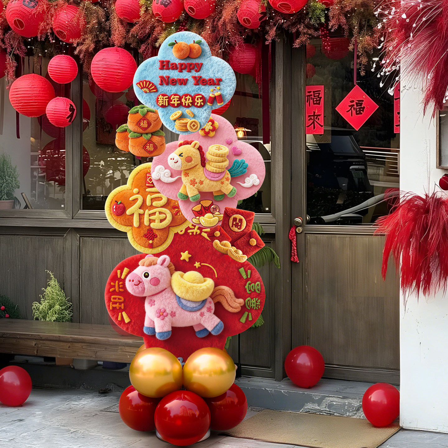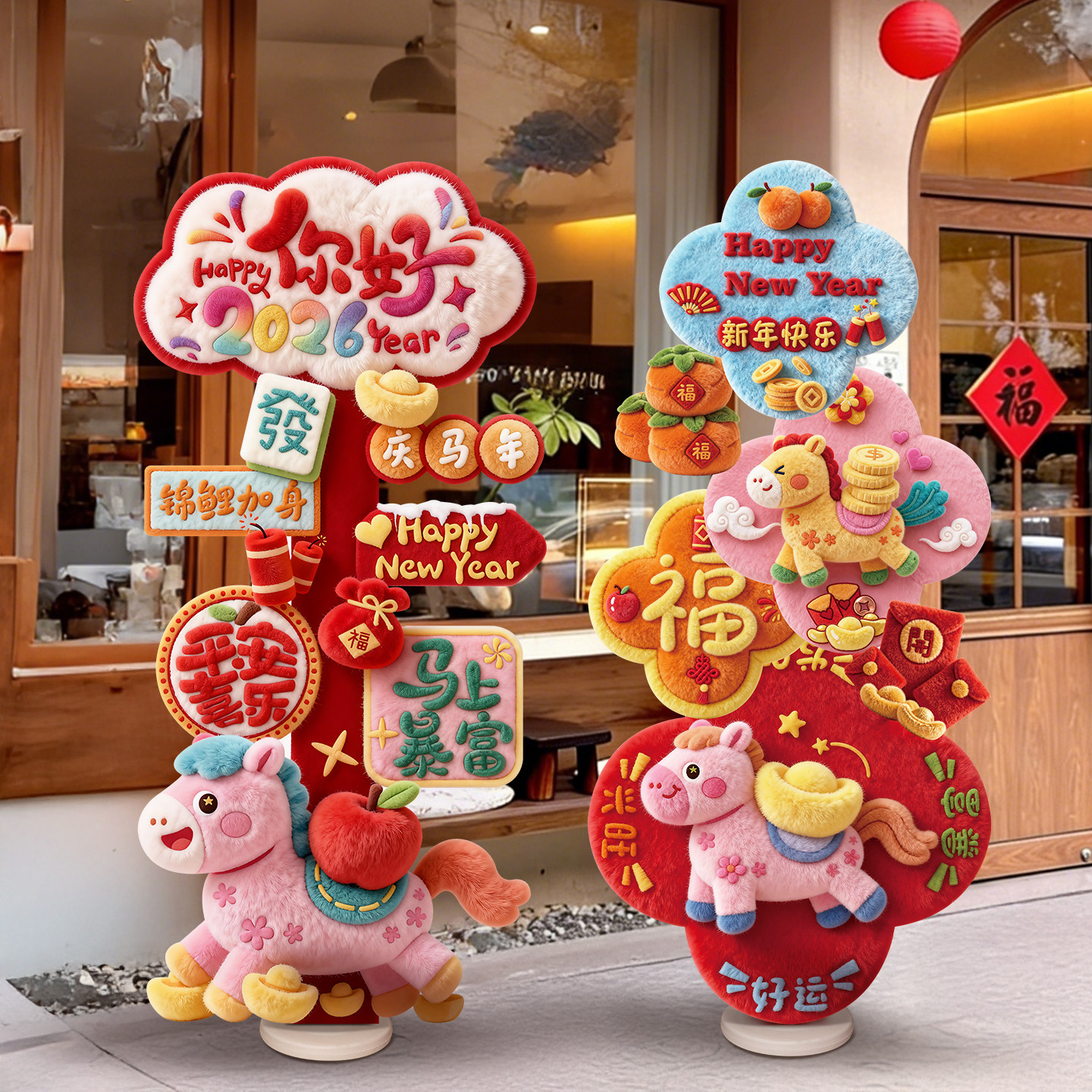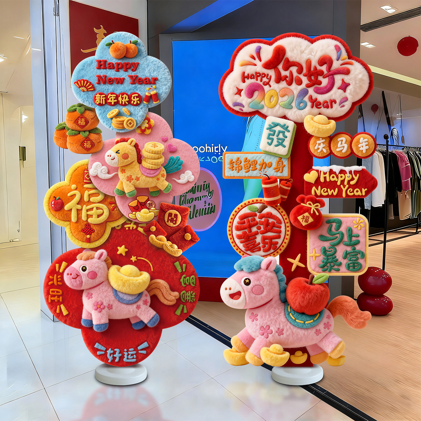 📚 新年装饰氛围场景布置2026过年门店铺毛绒感指引路牌打卡墙kt展板