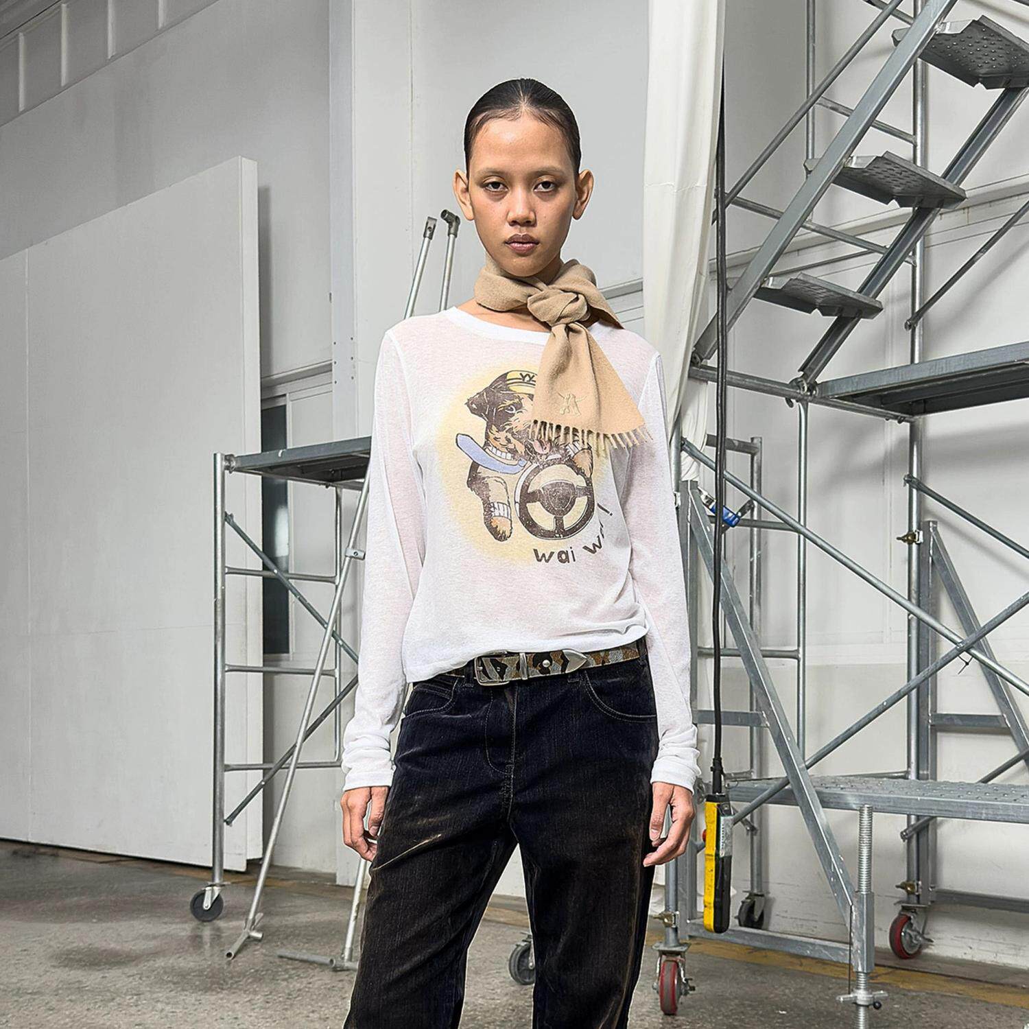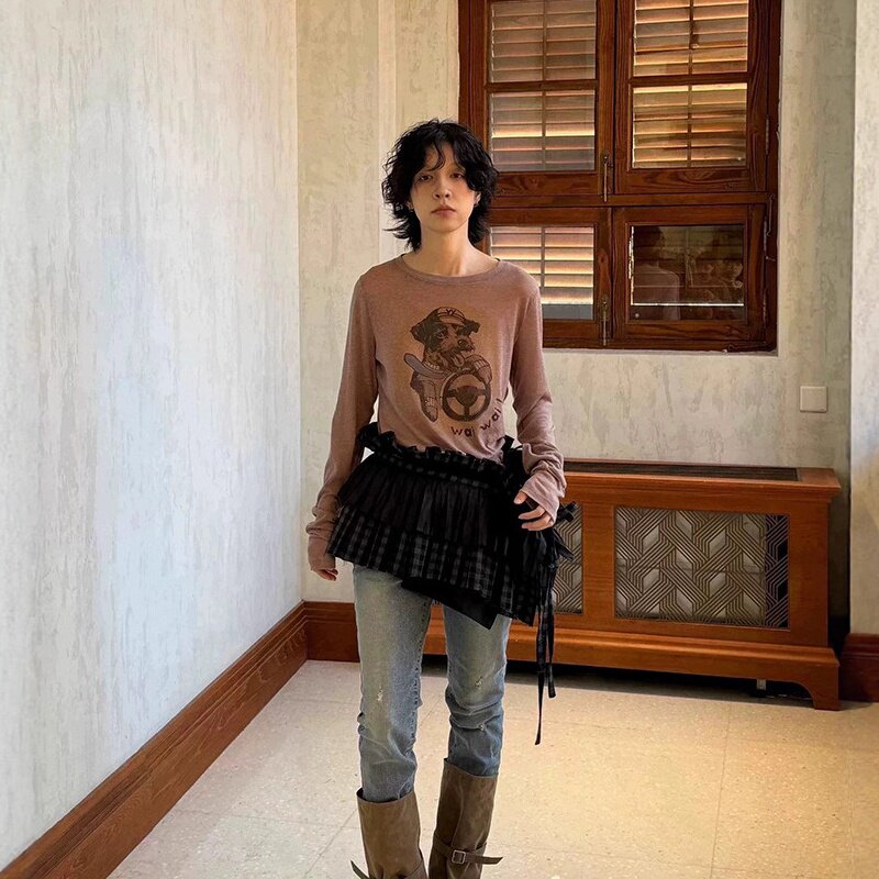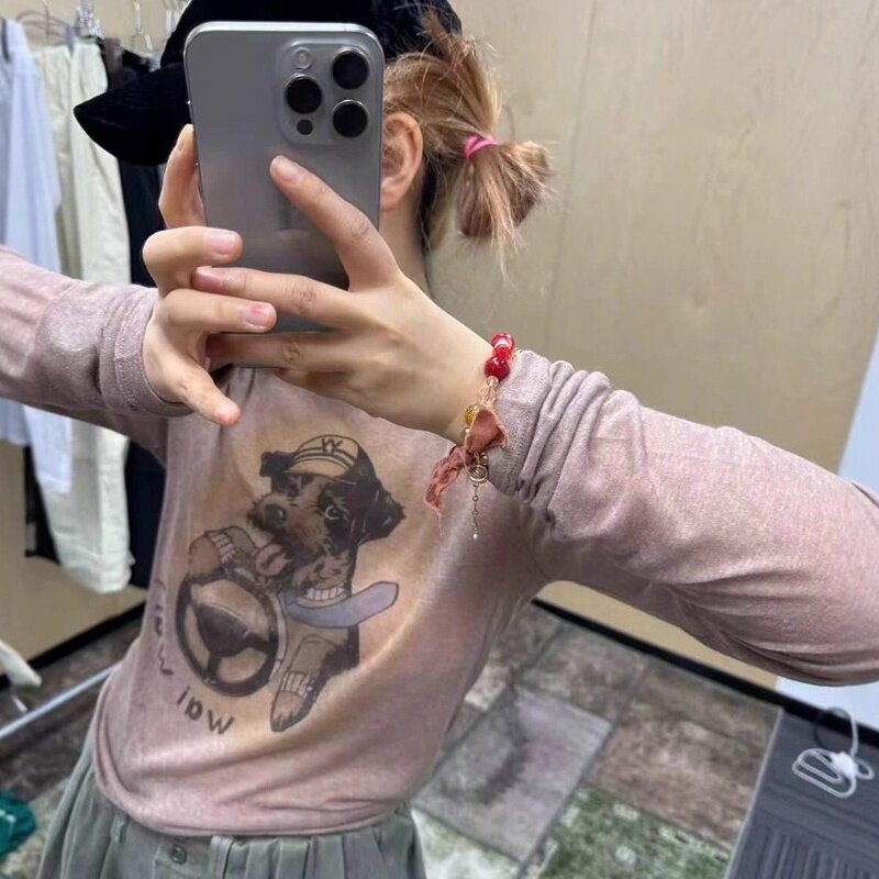 📚 open Yy现货25秋韩国东大门修身显瘦小狗印花圆领薄款微透长袖T恤