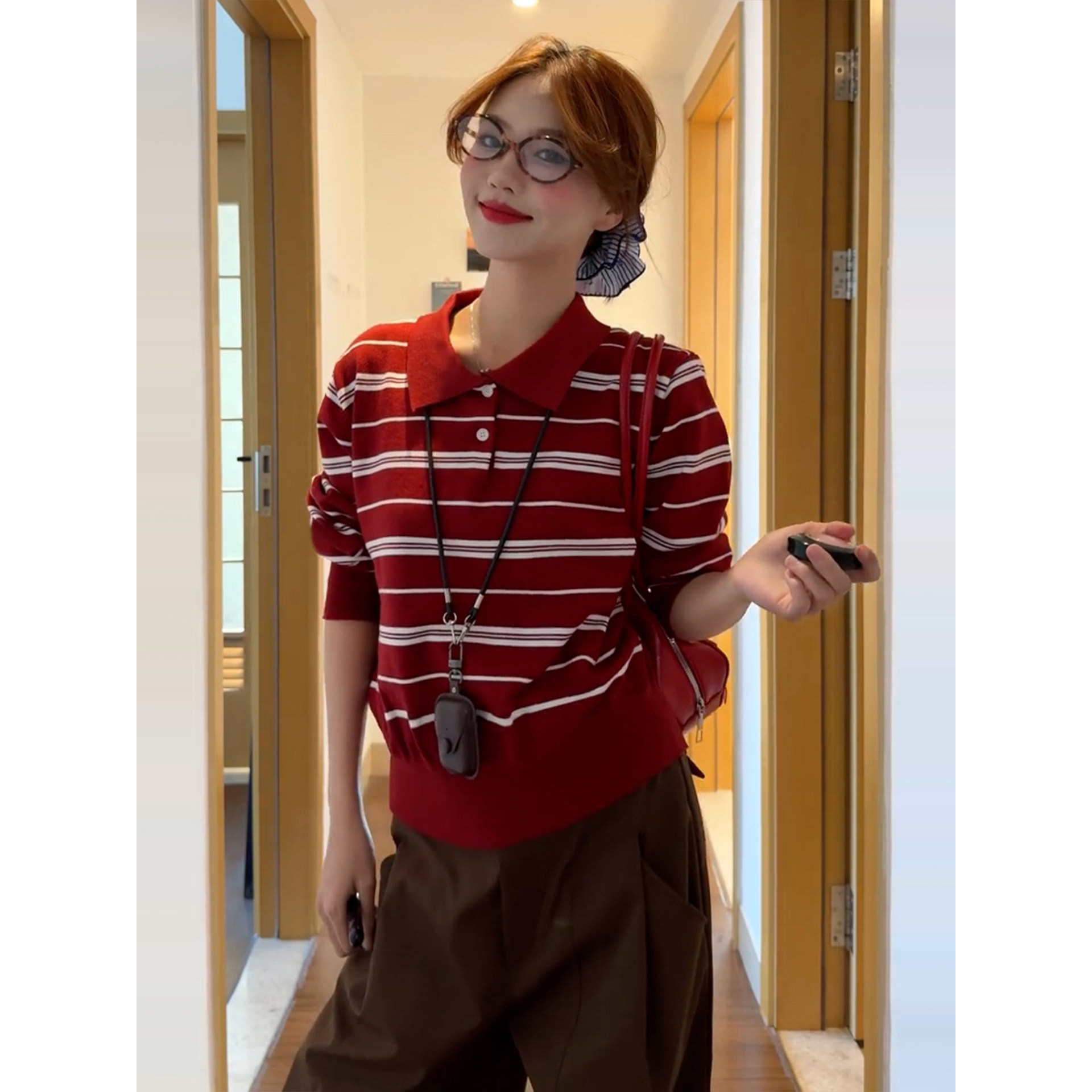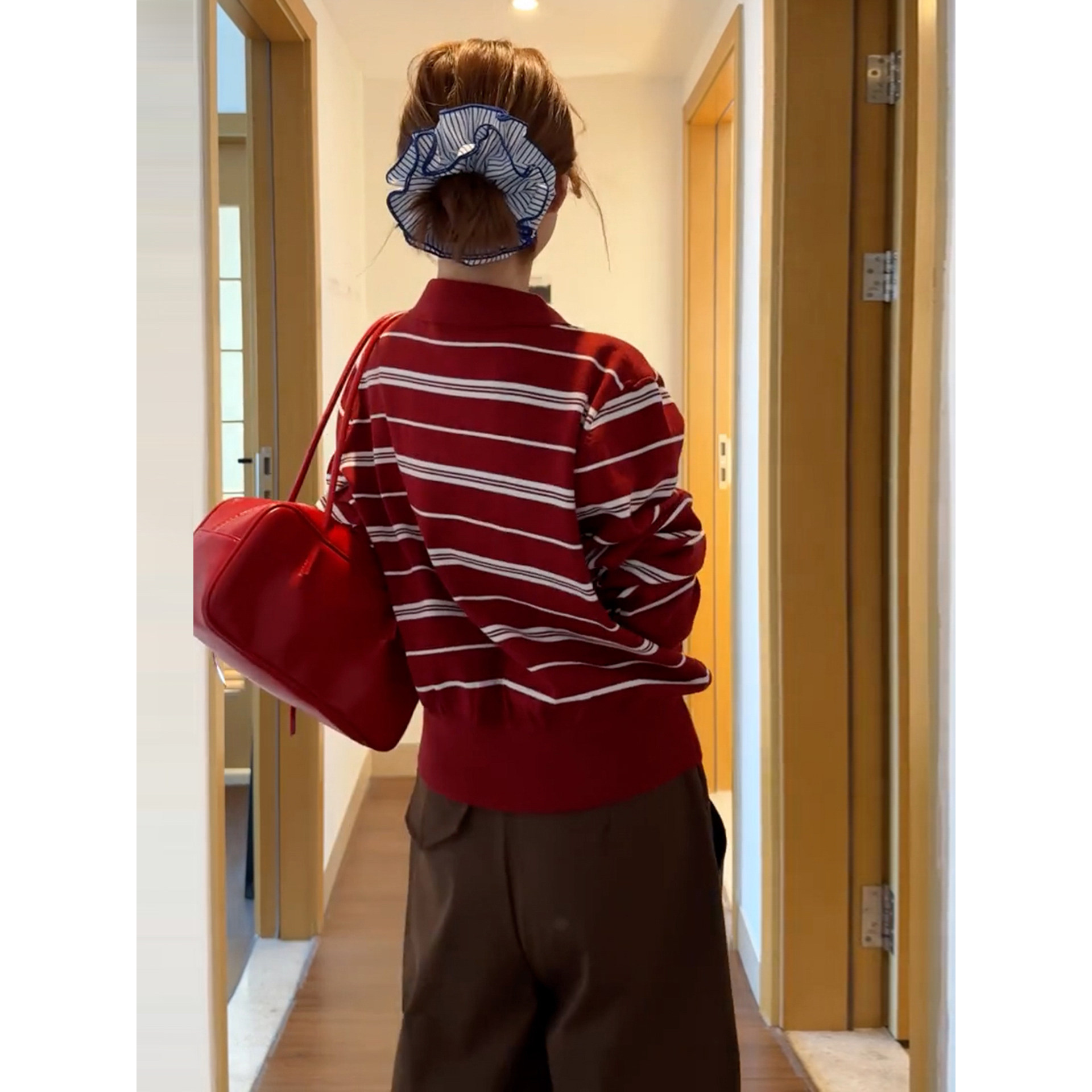 📚 美式红色条纹长袖针织polo衫女秋季老钱风巨好看宽松miu系上衣t恤