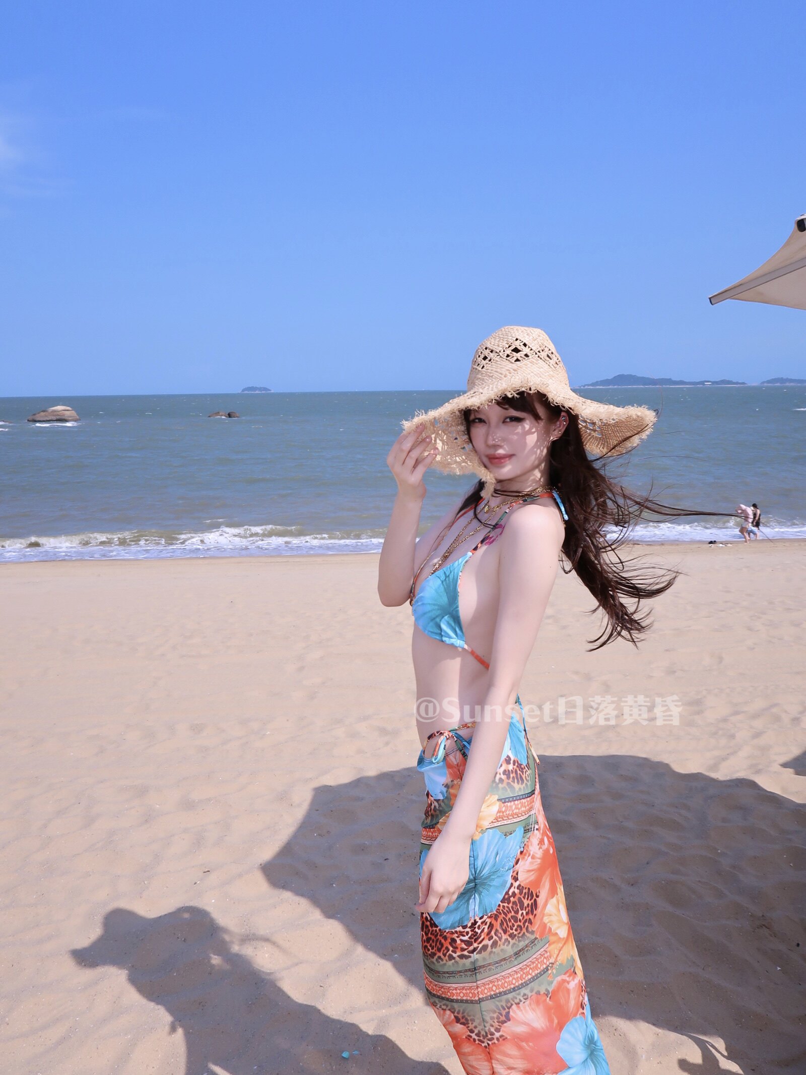 📚 Sunset日落黄昏欧美豹纹橘蓝拼接度假风印花性感比基尼网纱三件套