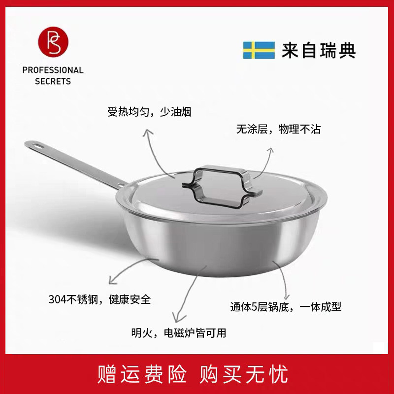 📚 瑞典PS主厨秘密不锈钢煎炒锅无涂层物理不粘锅炉灶通用家用炒菜锅