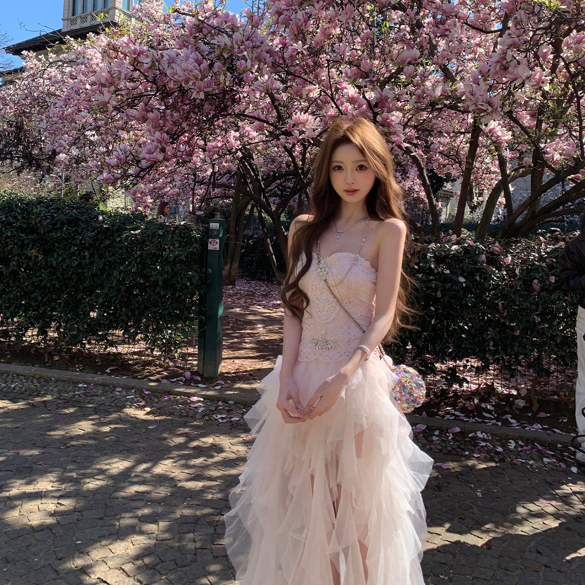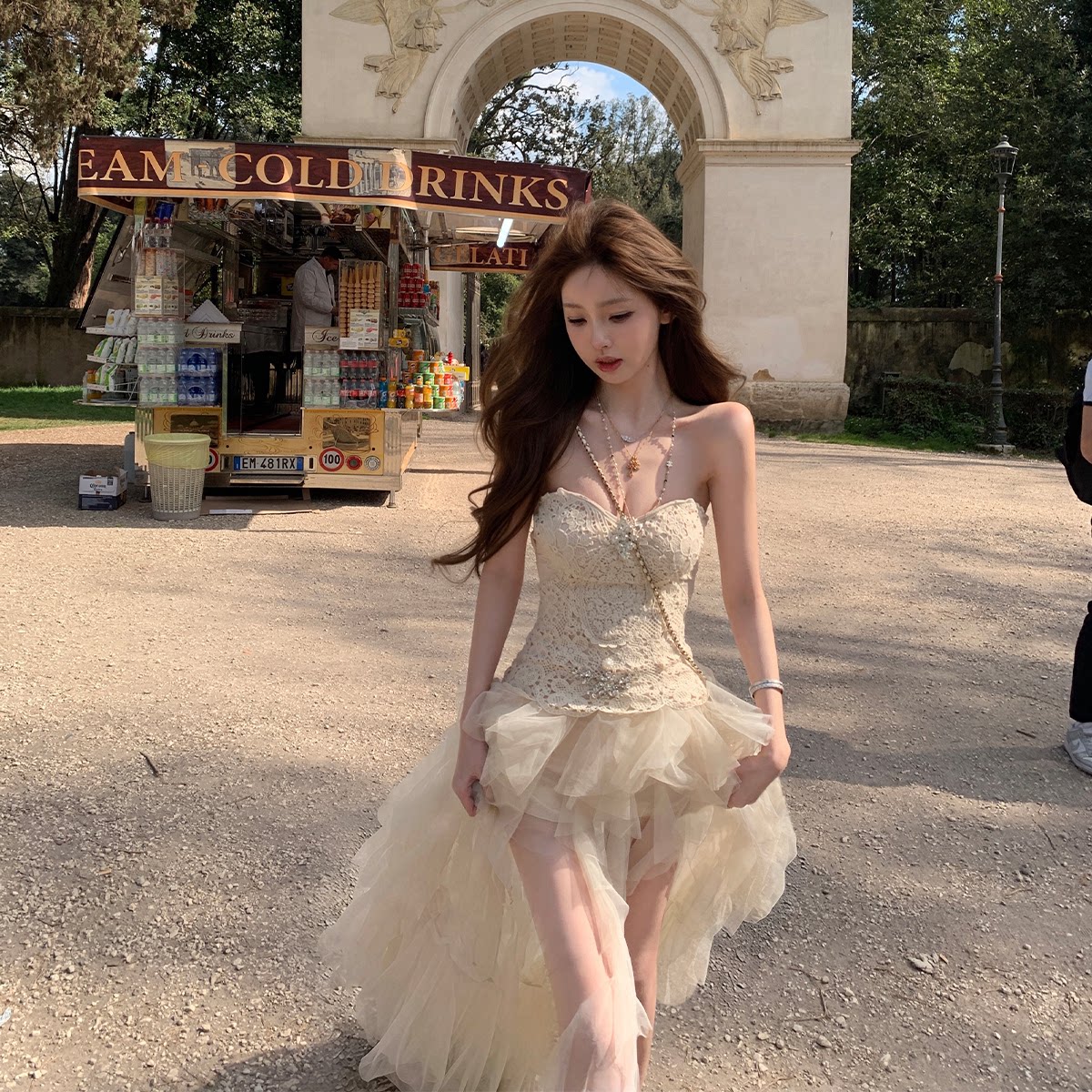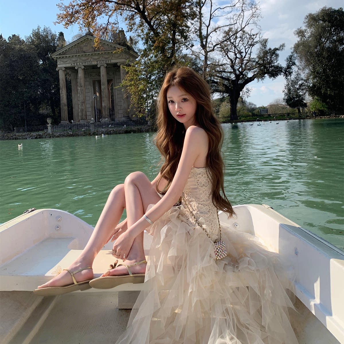 📚 你的懒懒llan【纯白瓷骨】重工蕾丝钻扣立体花型层叠纱裙连衣裙女