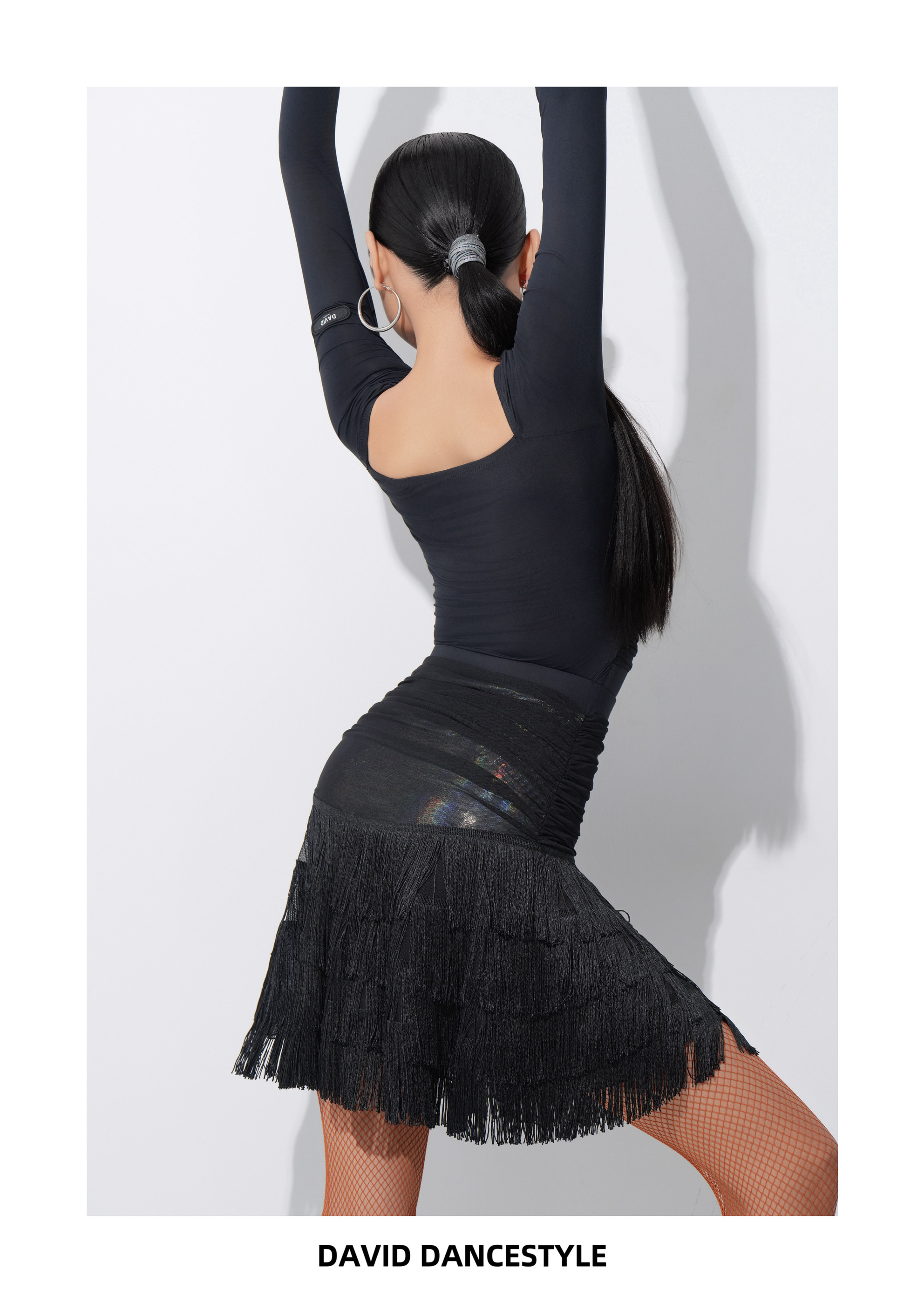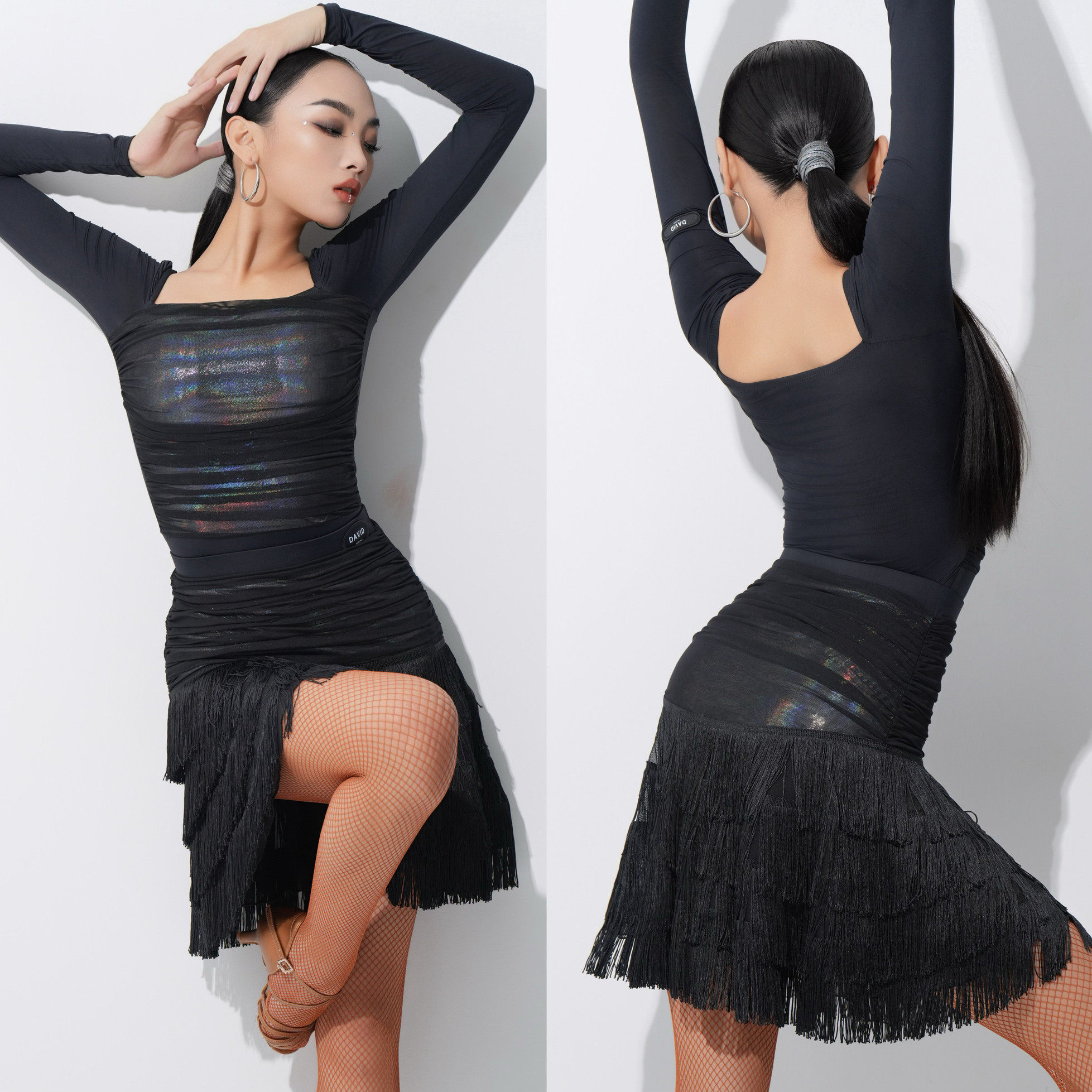 📚 David舞服拉丁舞女士方领专业镭射光泽多层流苏练习服套装长袖