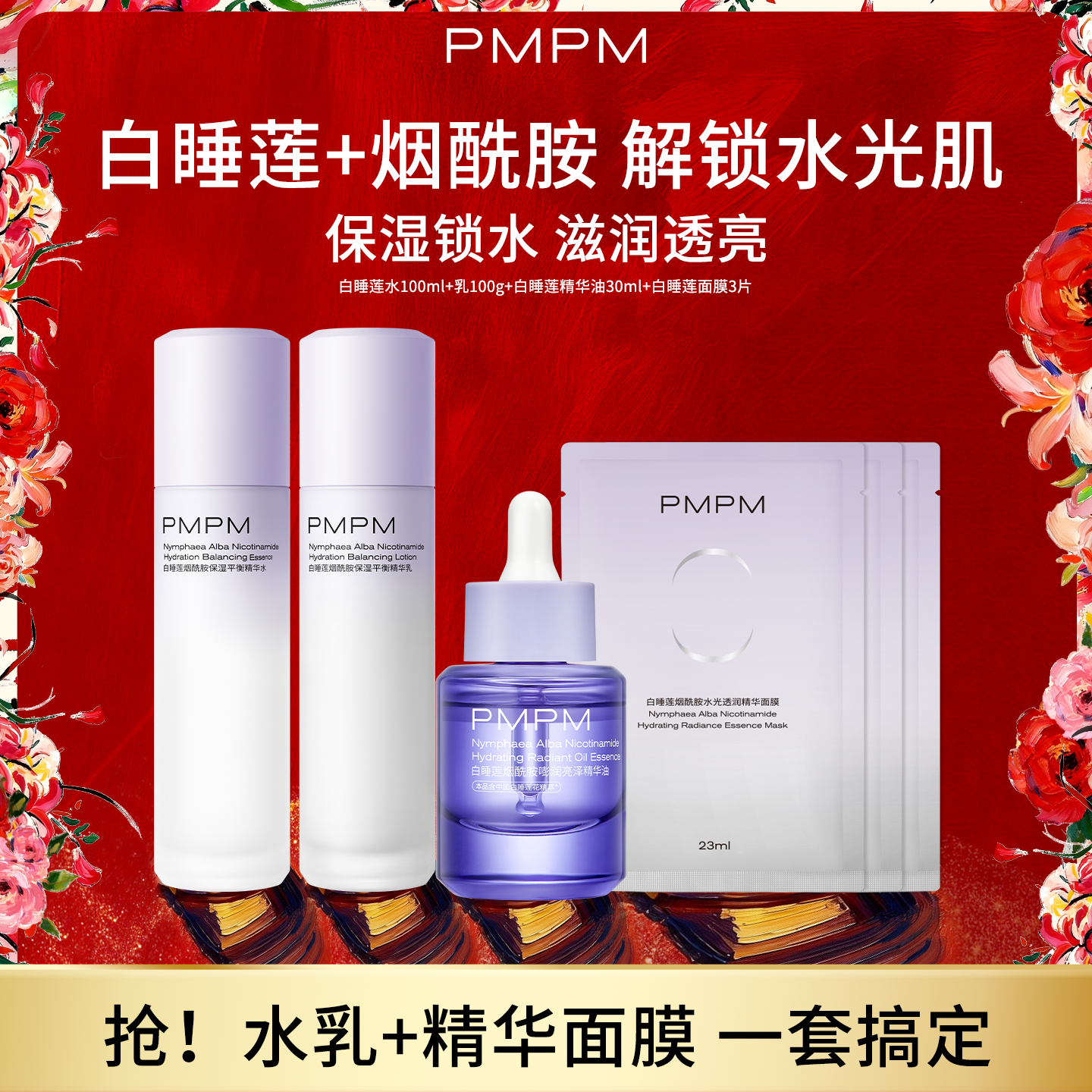 📚 【护肤大全套】PMPM白睡莲水乳精华油面膜套装补水保湿