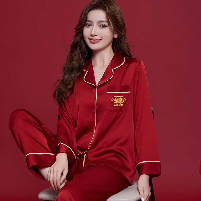 📚 结婚睡衣新婚情侣冰丝长袖红色本命年薄款丝绸婚用家居服礼盒套装