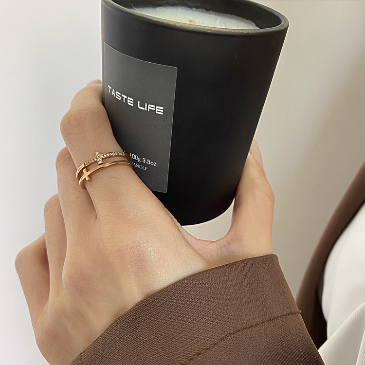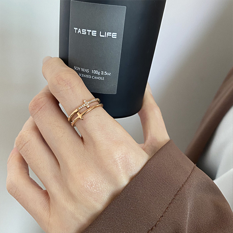📚 ZUORAN 韩风ins时尚小众双层玫瑰金镶钻十字设计感气质戒指RF139