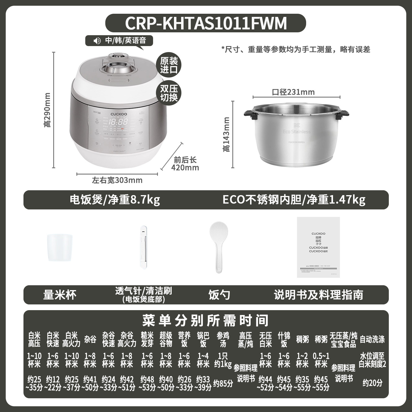 📚 CUCKOO福库电饭煲韩国原装进口IH无涂层双压KHTAS1011FWM双子星5L