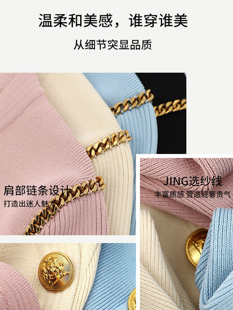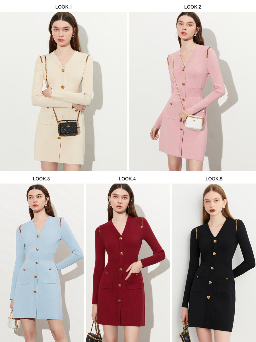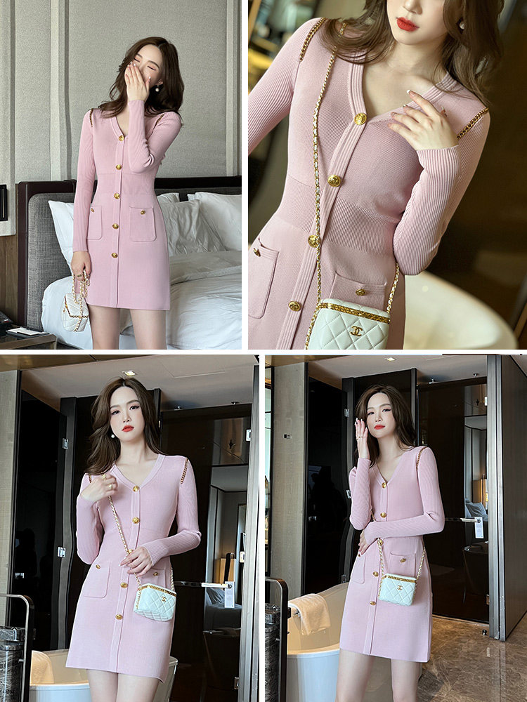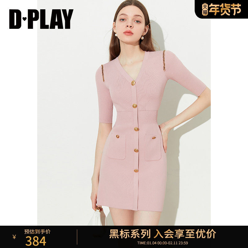 📚 DPLAY黑标夏新款气质灰粉色V领修身金属扣链条中袖针织连衣裙