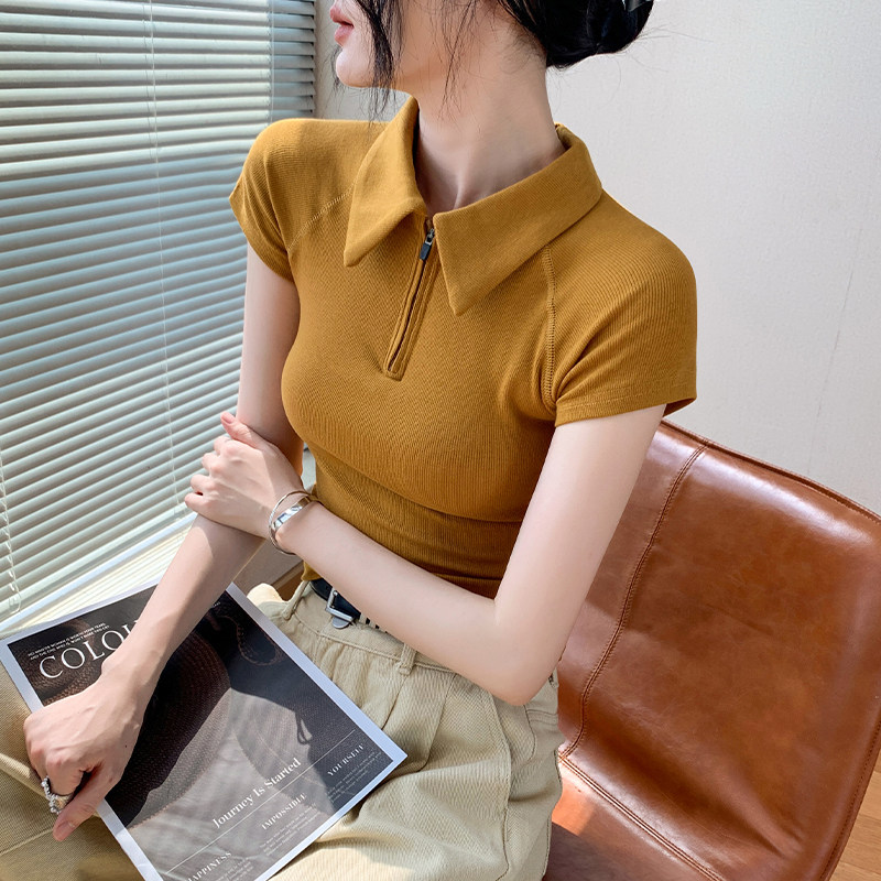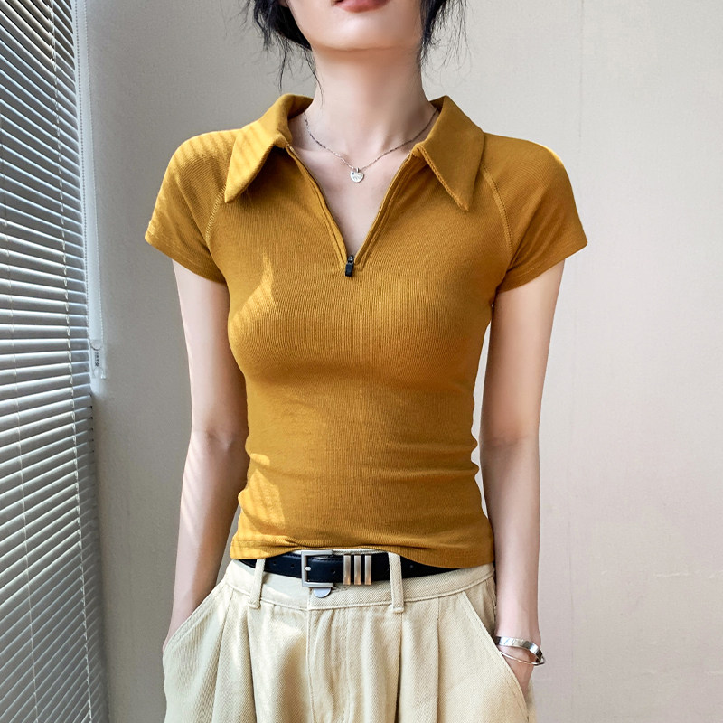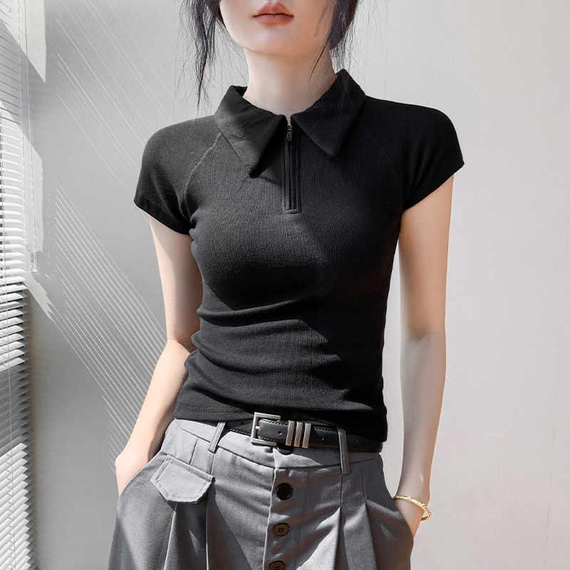 📚 polo衫正肩短袖T恤女2025夏季新款修身显瘦纯色小众翻领拉链上衣