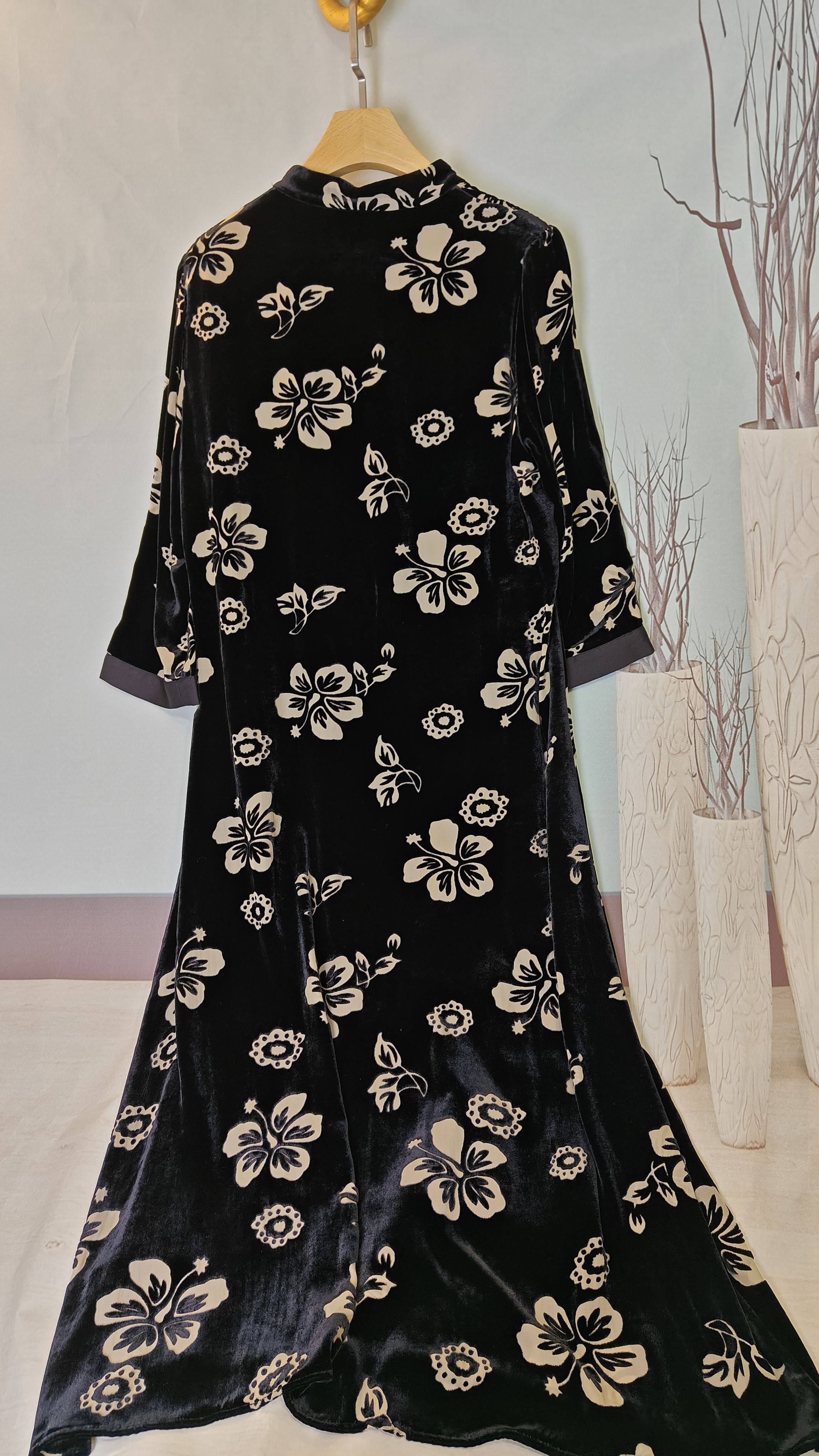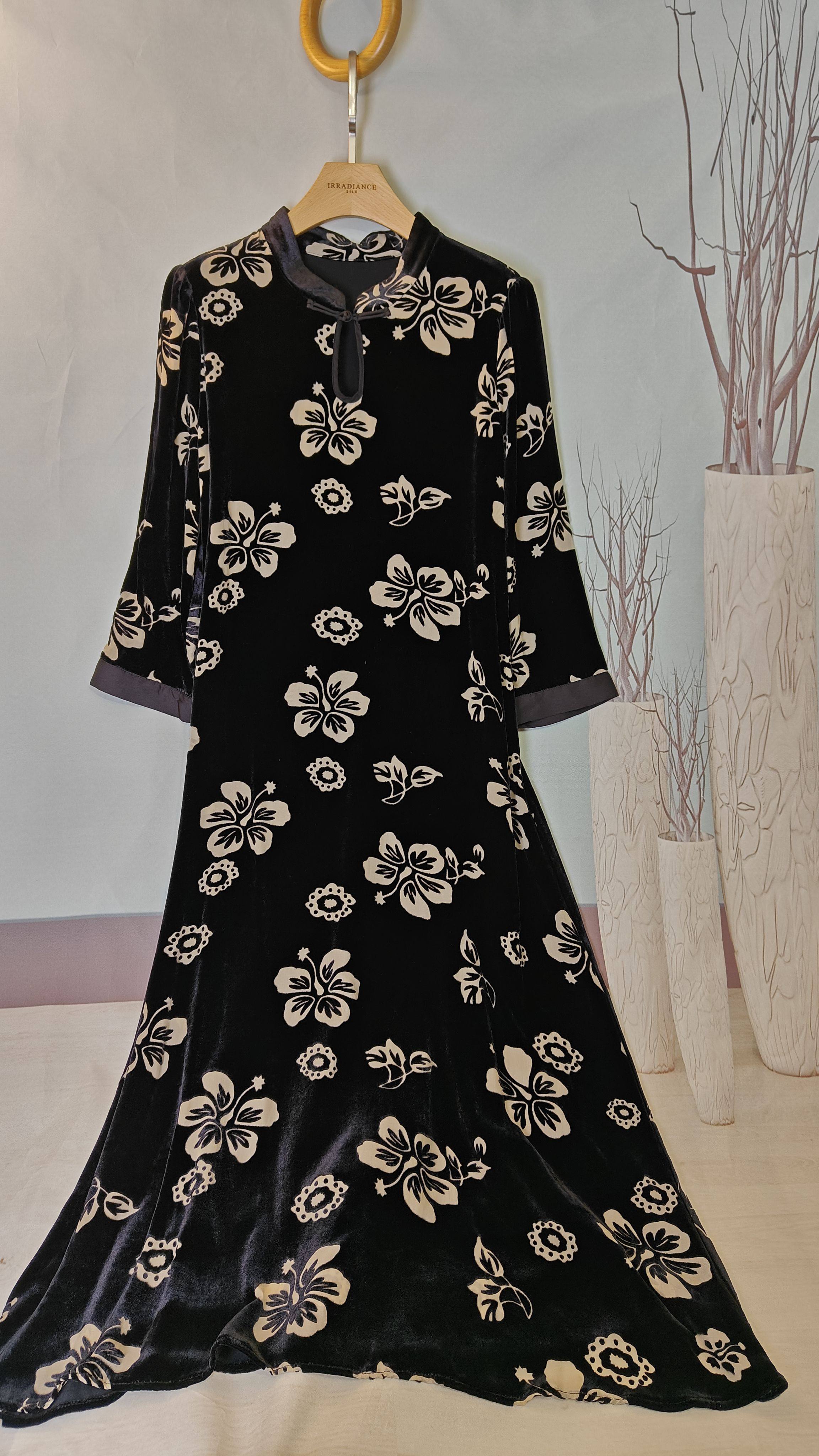 📚 高档真丝烂花绡旗袍长款七分袖2025年春季丝绒款复古中国风连衣裙