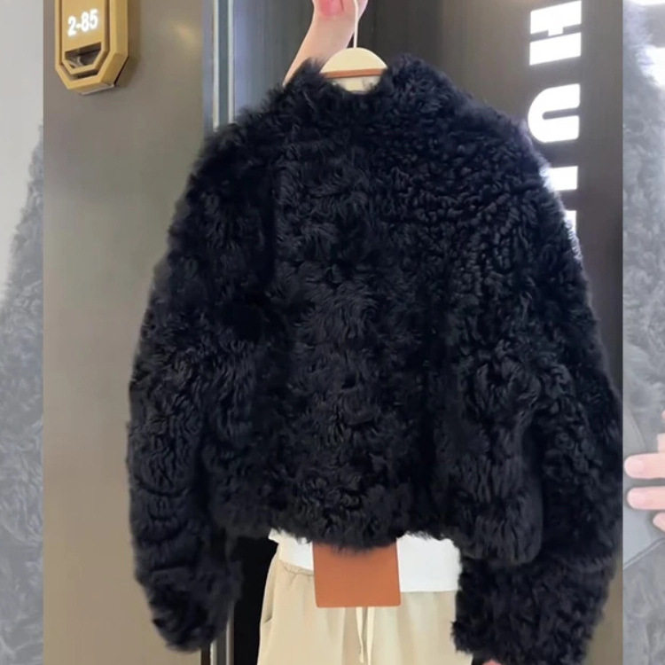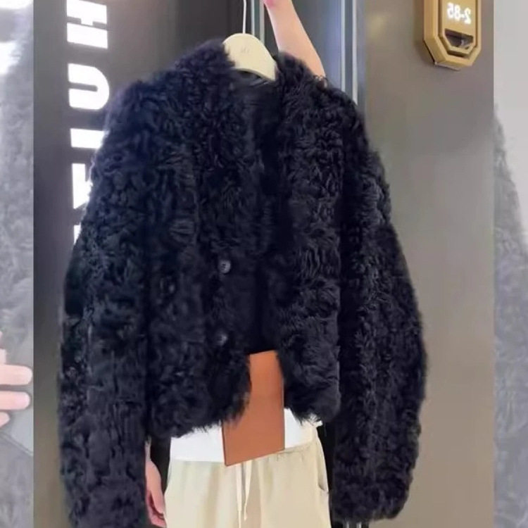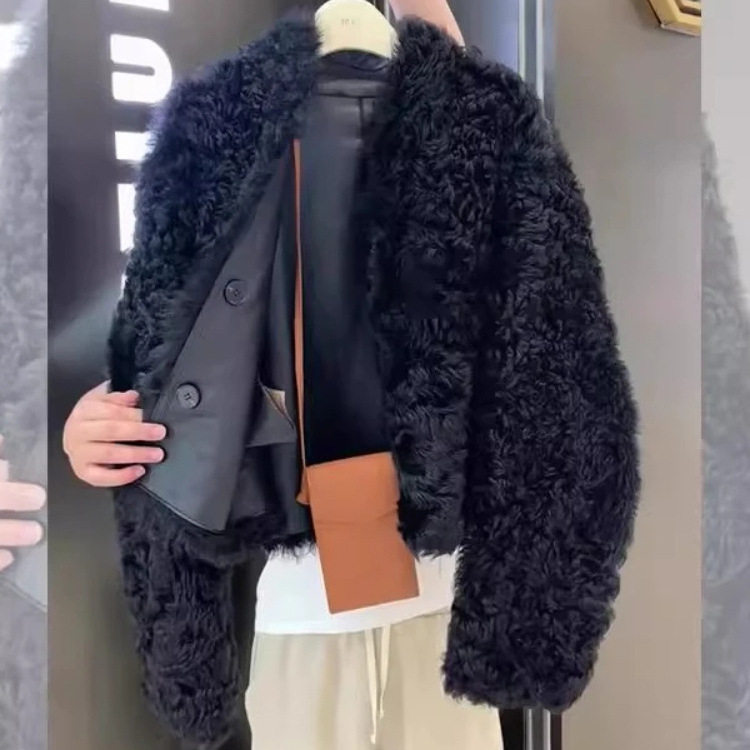 📚 黑色单排扣短款羊羔毛外套女冬季加绒加厚小香风外搭皮毛一体上衣