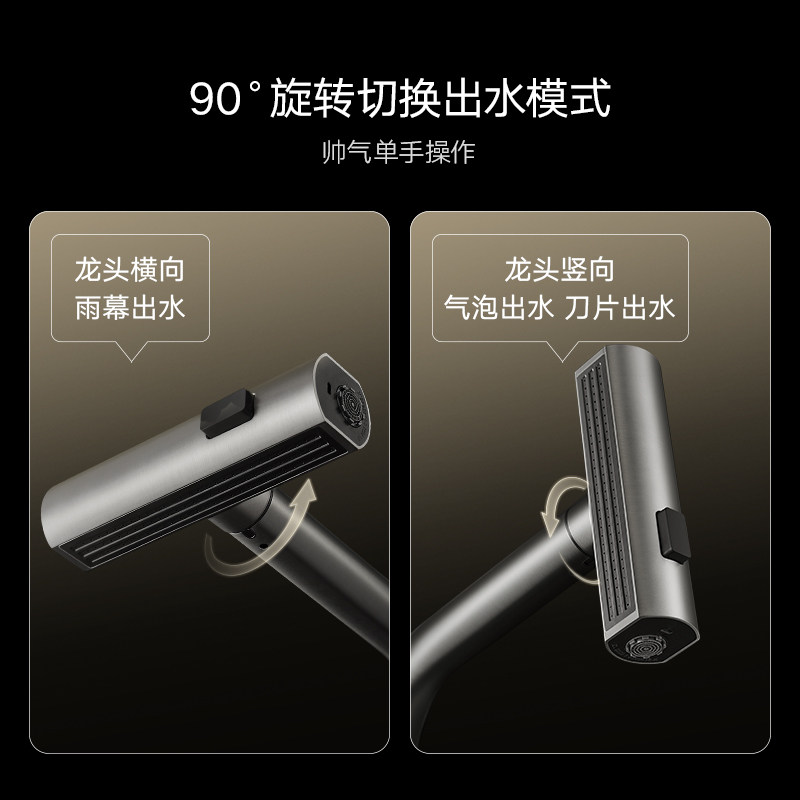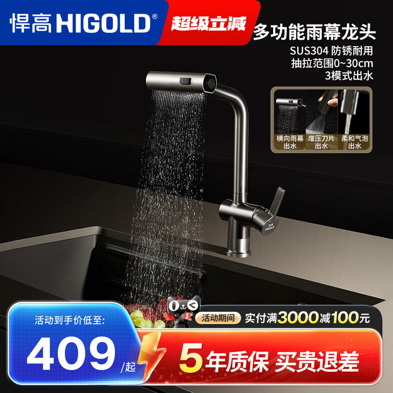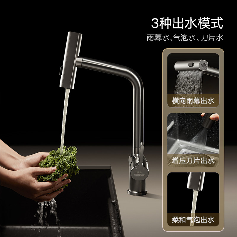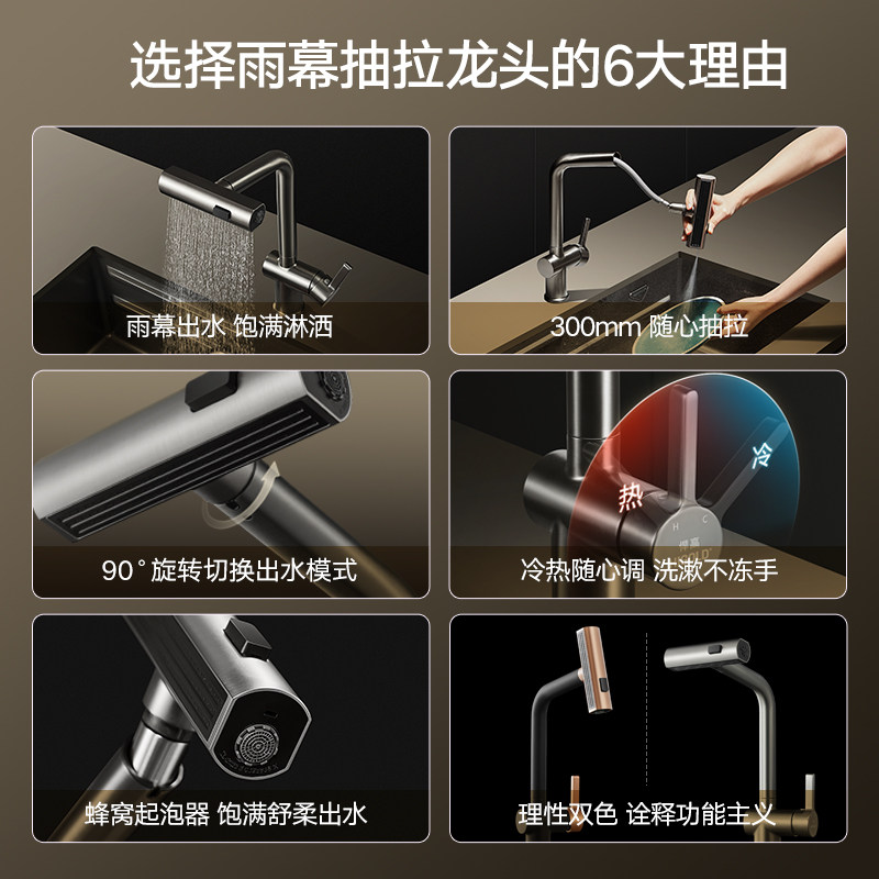 📚 悍高厨房水龙头304不锈钢旋转抽拉雨幕瀑布龙头多功能冷热水龙头