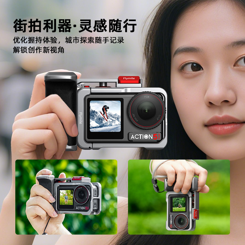 📚 Flymile适用大疆Action5Pro街拍手柄套装Osmo Action4运动相机街拍套装金属兔笼扫街快门握把磁吸快拆配件