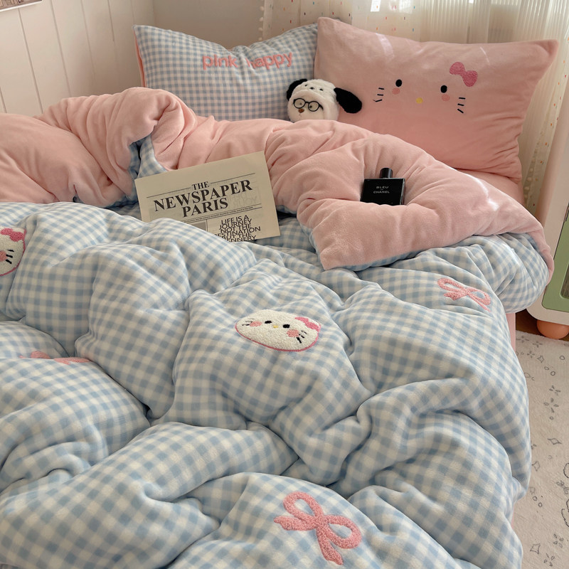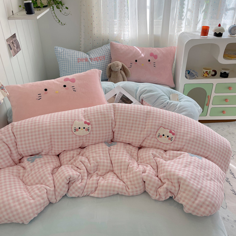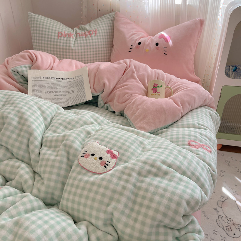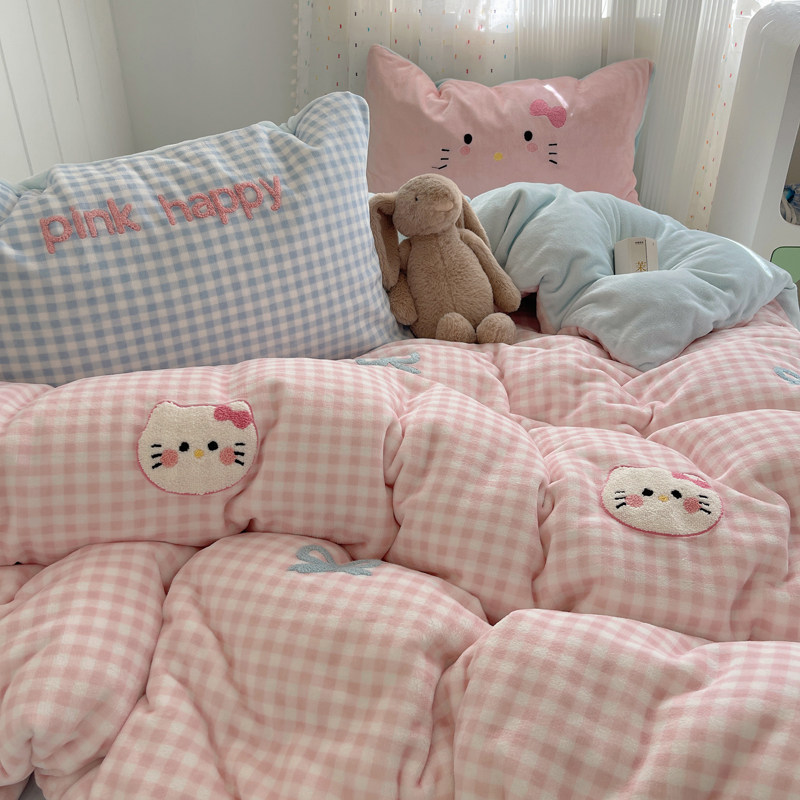 📚 晚安猫格子猫咪毛巾绣亲肤牛奶绒少女四件套学生宿舍被套床上用品
