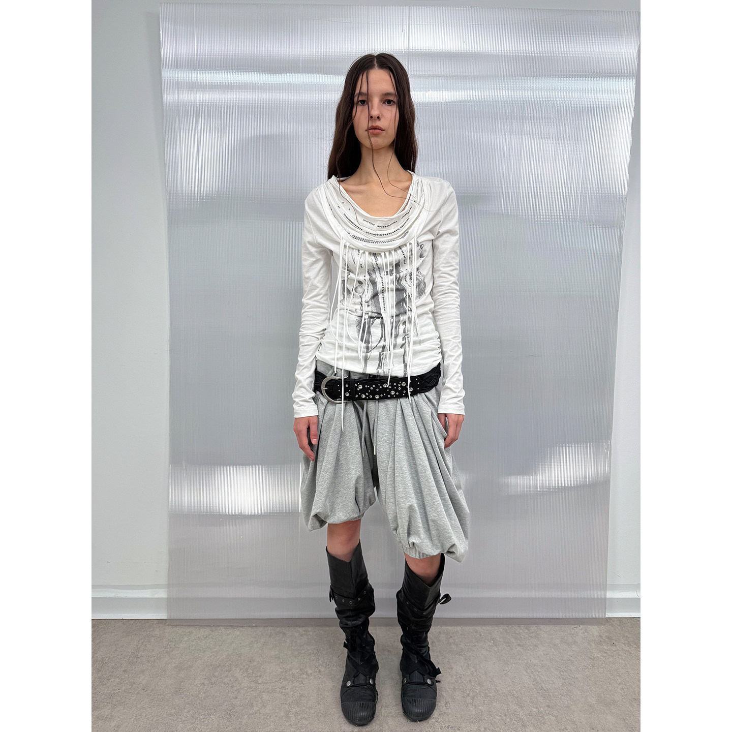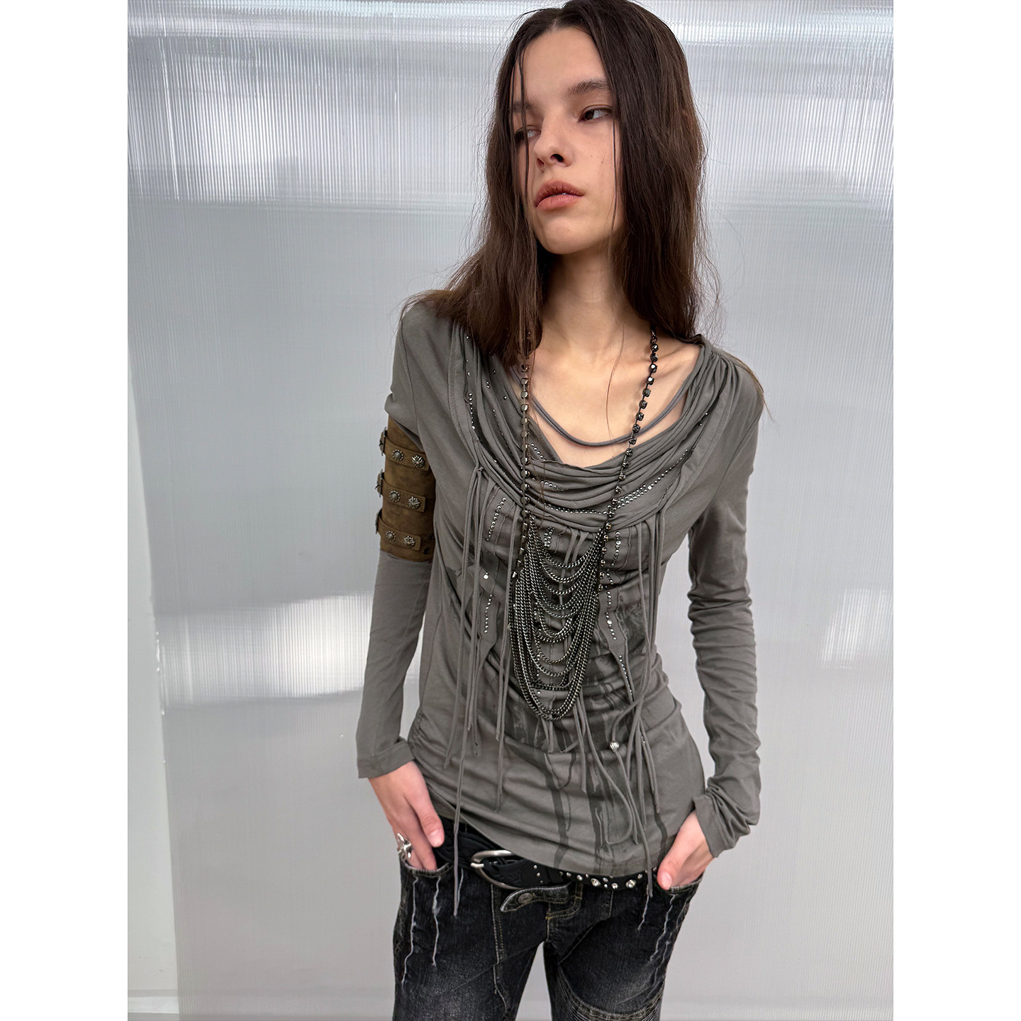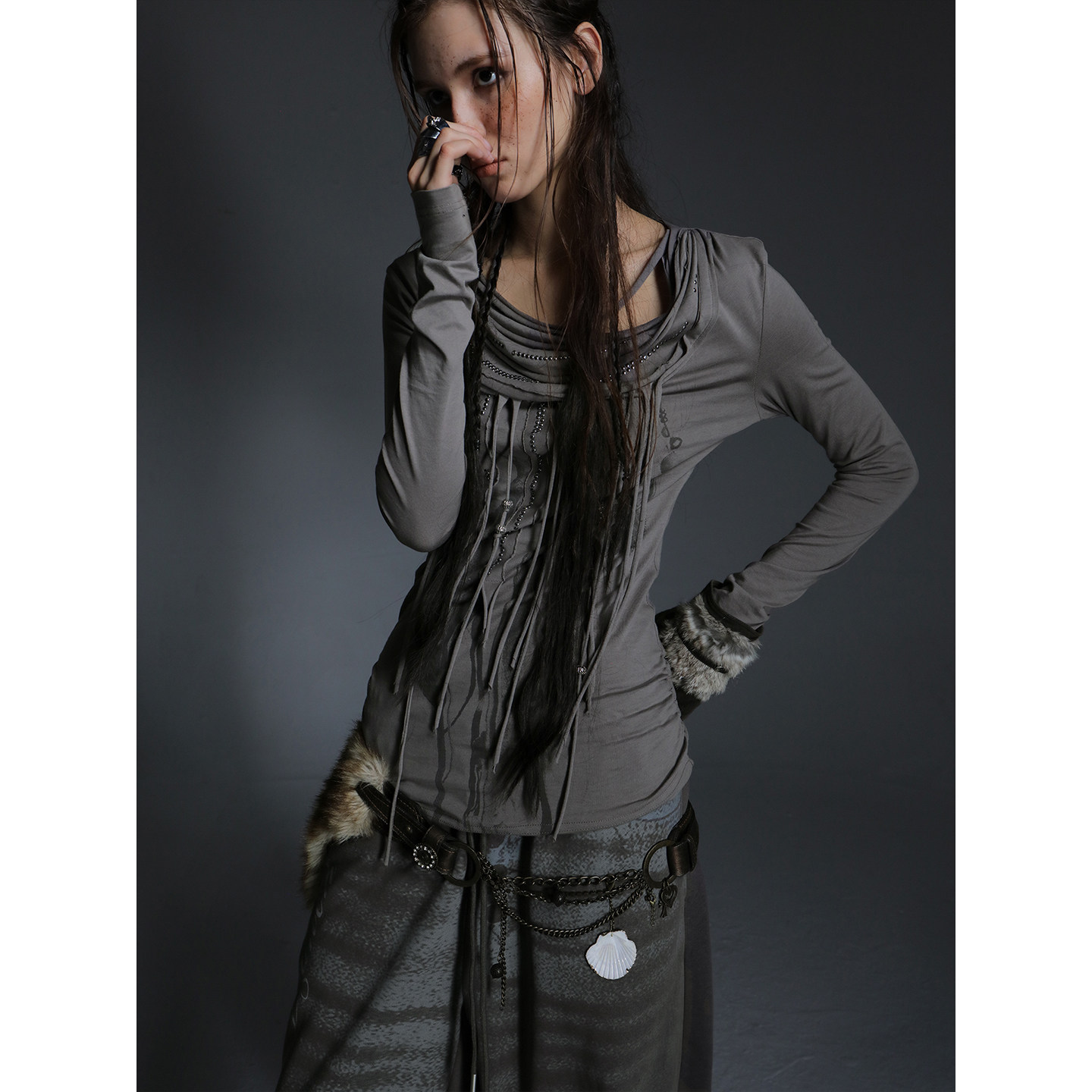 📚 DoublePunch秋冬原创荡领多层流苏羽毛印花流浪风打底T恤长袖上衣