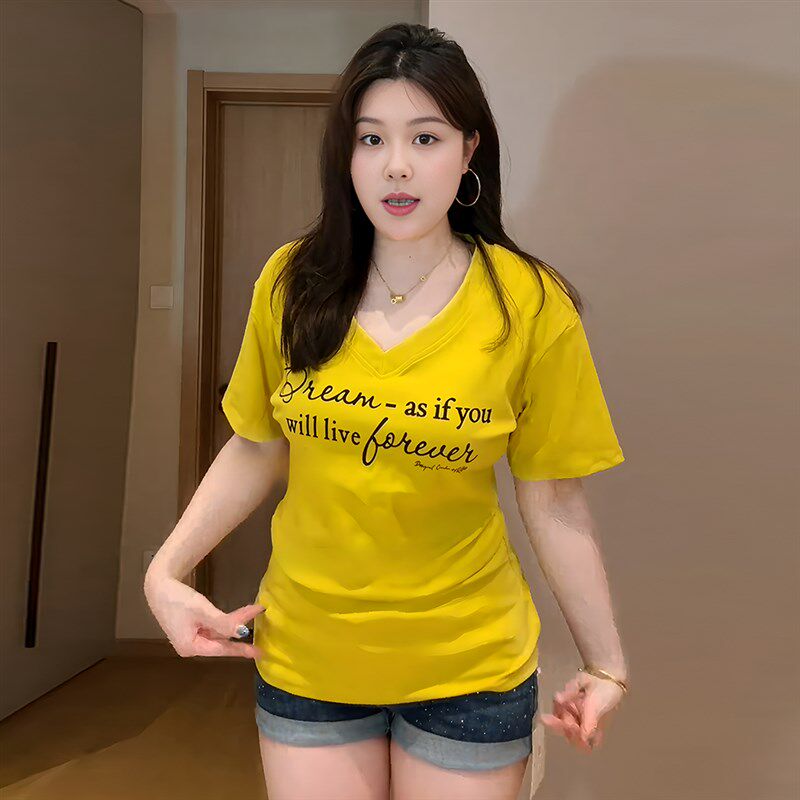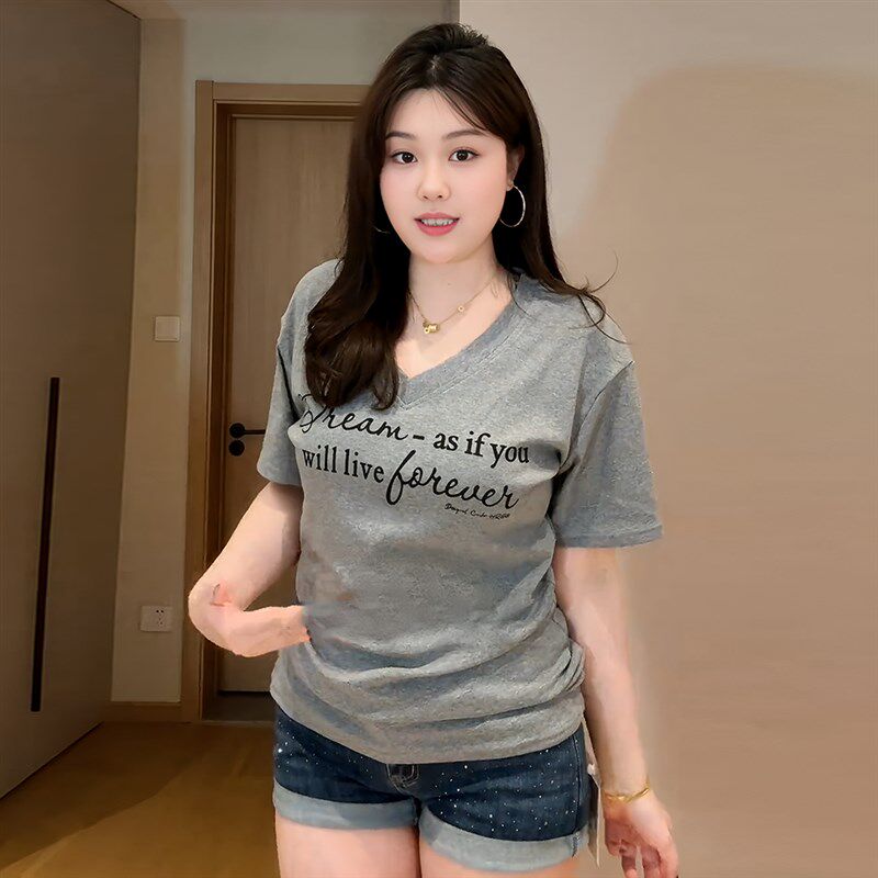 📚 大码女装辣妹灰色V领正肩掐腰短袖t恤夏季新款微胖mm修身显瘦上衣