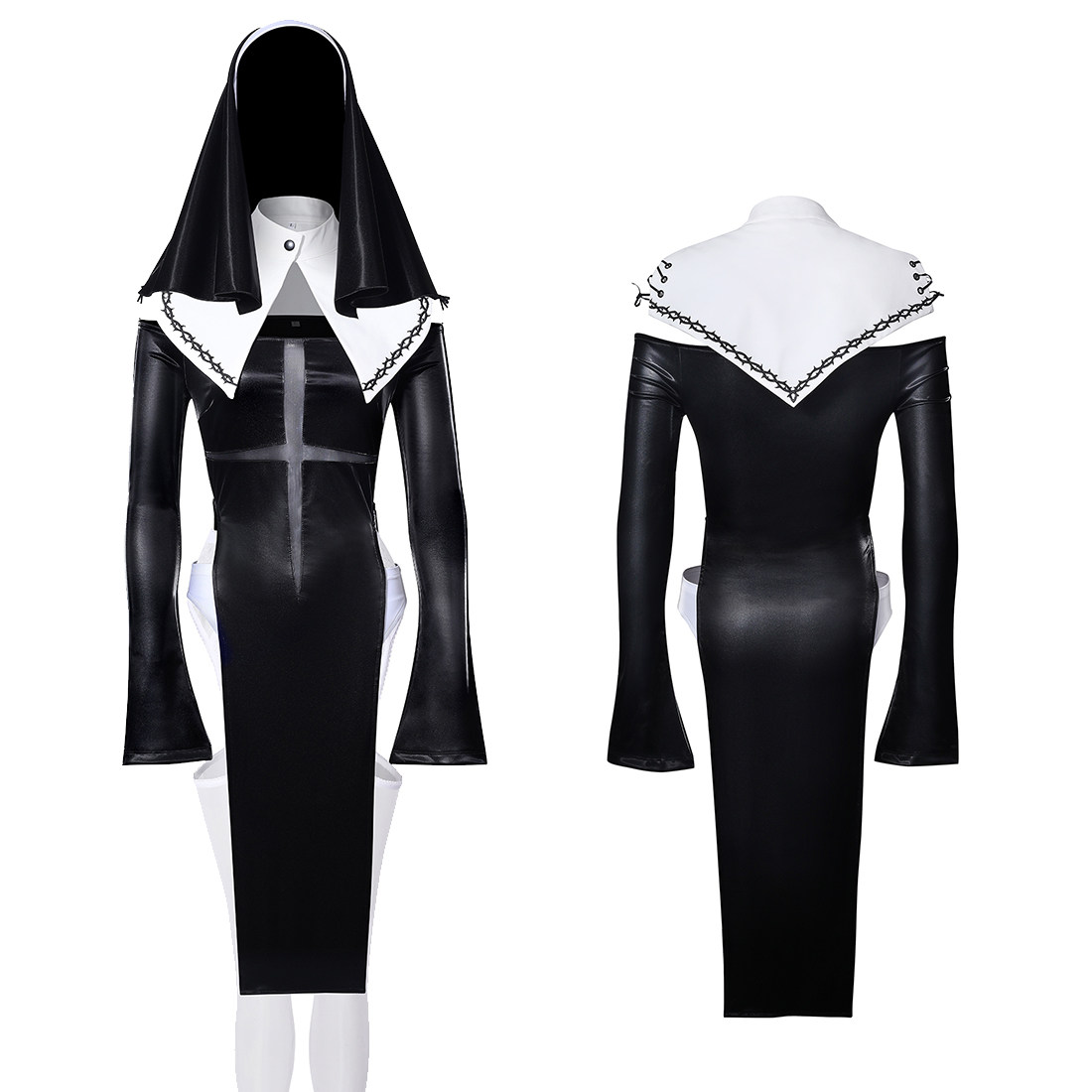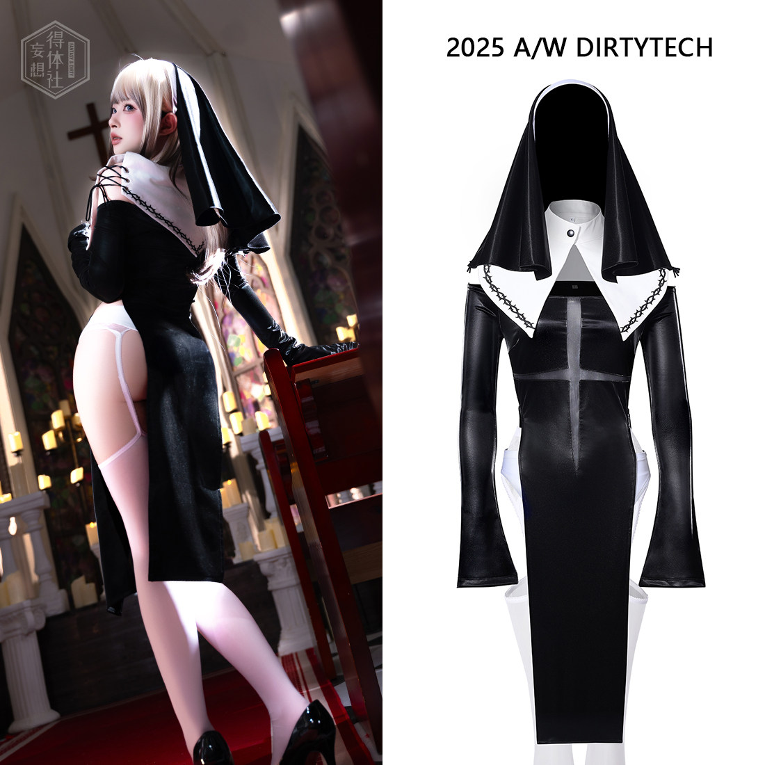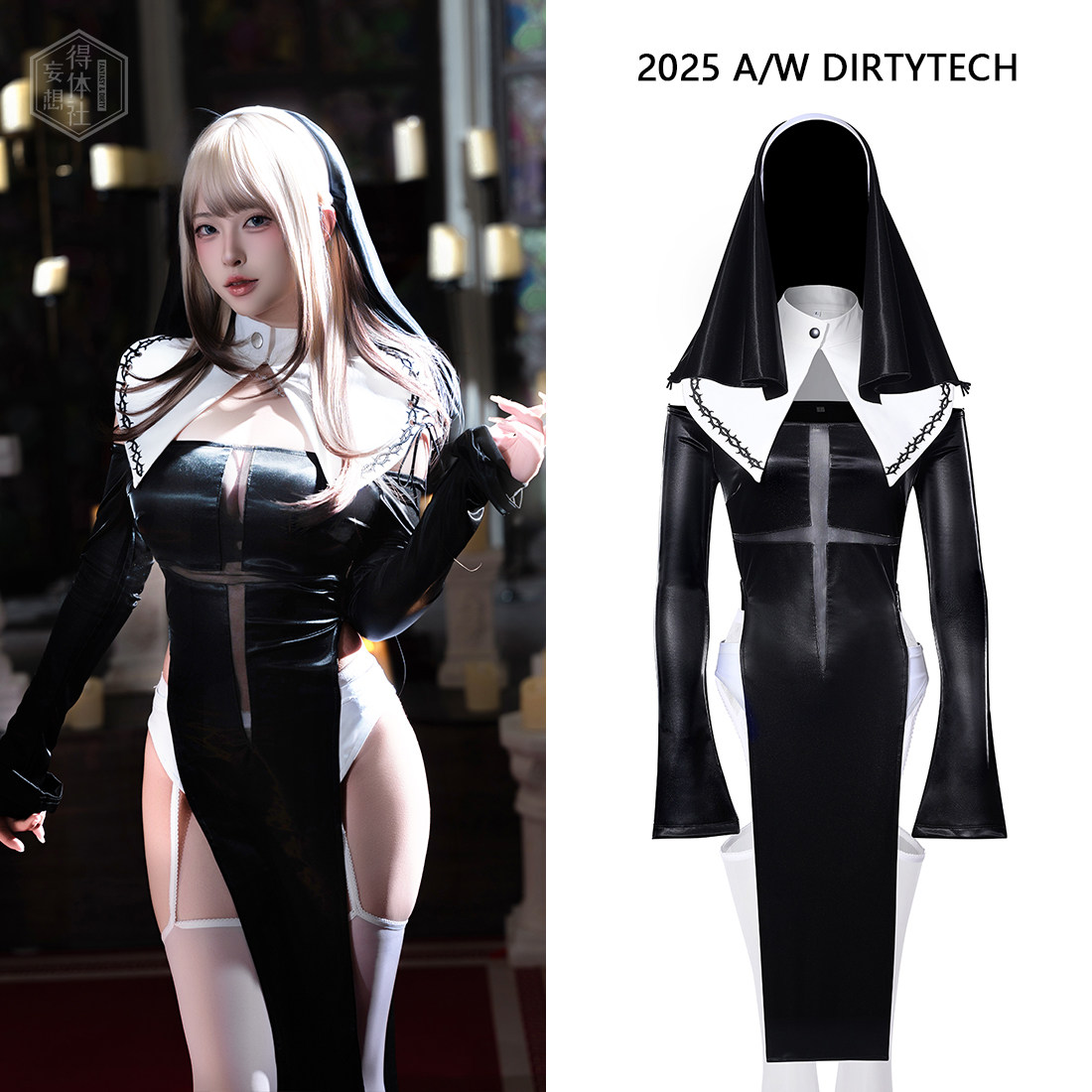 📚 得体社 原创十字星高叉拼接网纱弹力光泽性感cos修女套装