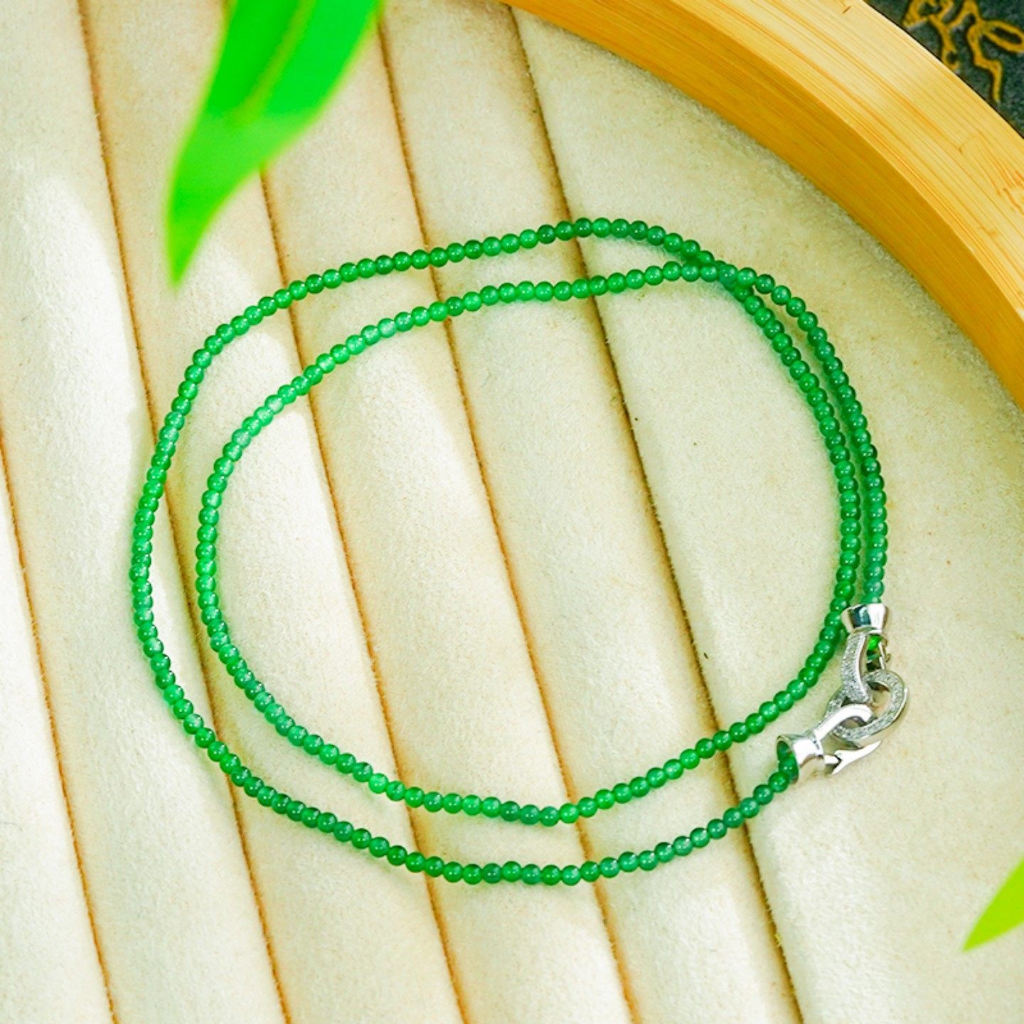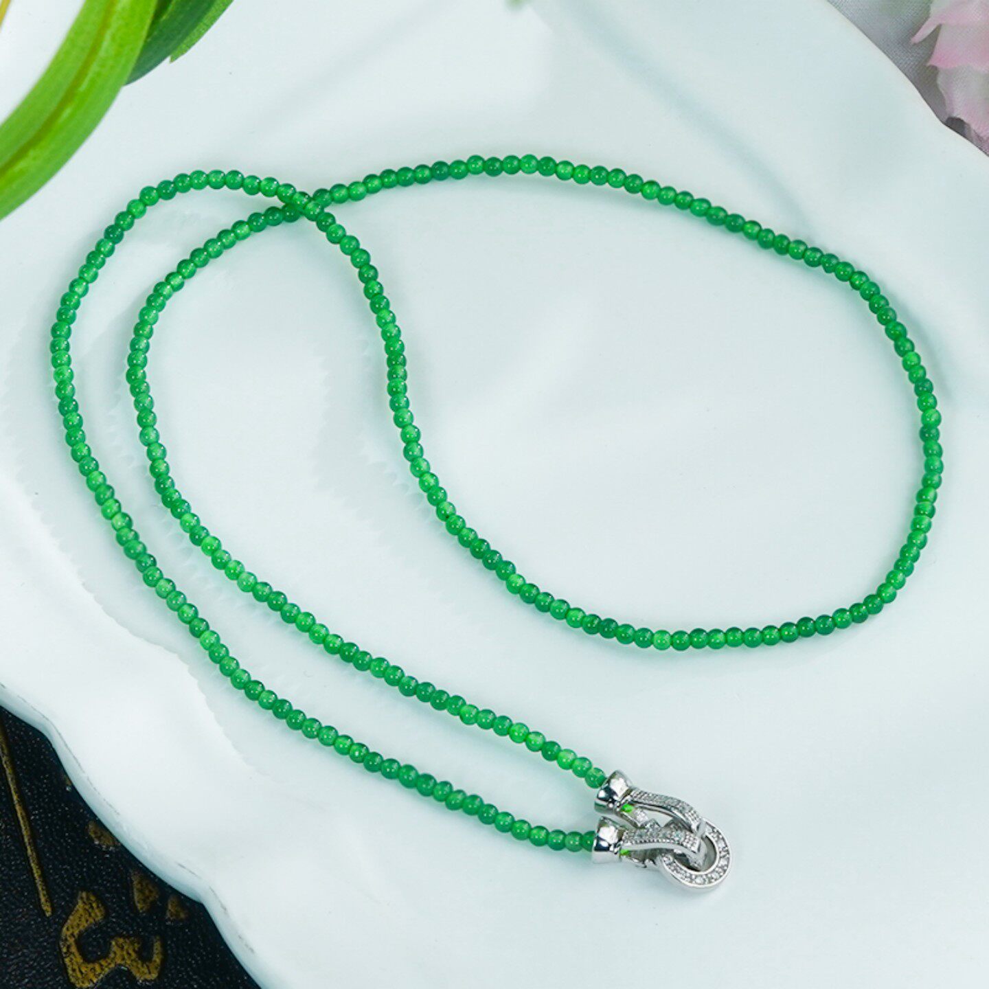 📚 天然翡翠吊坠A货银镶嵌时尚简约满绿小米珠翡翠万能扣项链(2mm