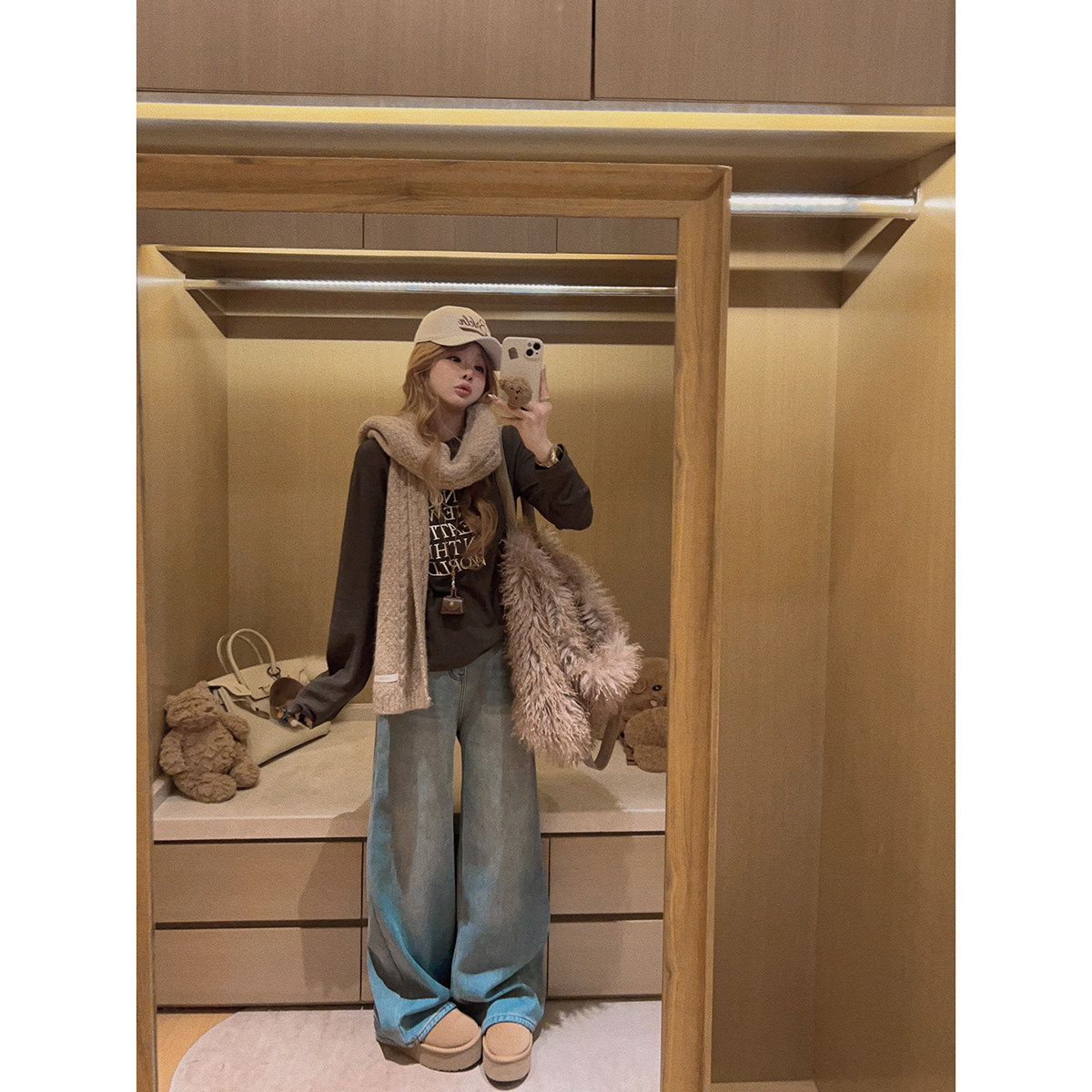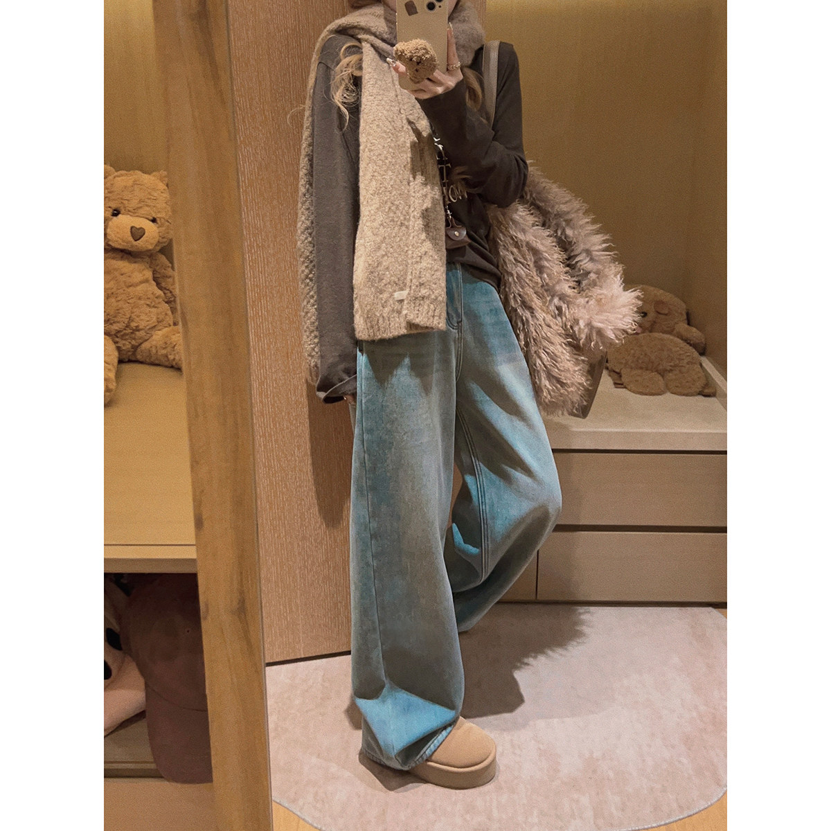 📚 Yukiss 小个子复古加绒高腰直筒阔腿牛仔裤女冬韩系宽松显瘦裤子