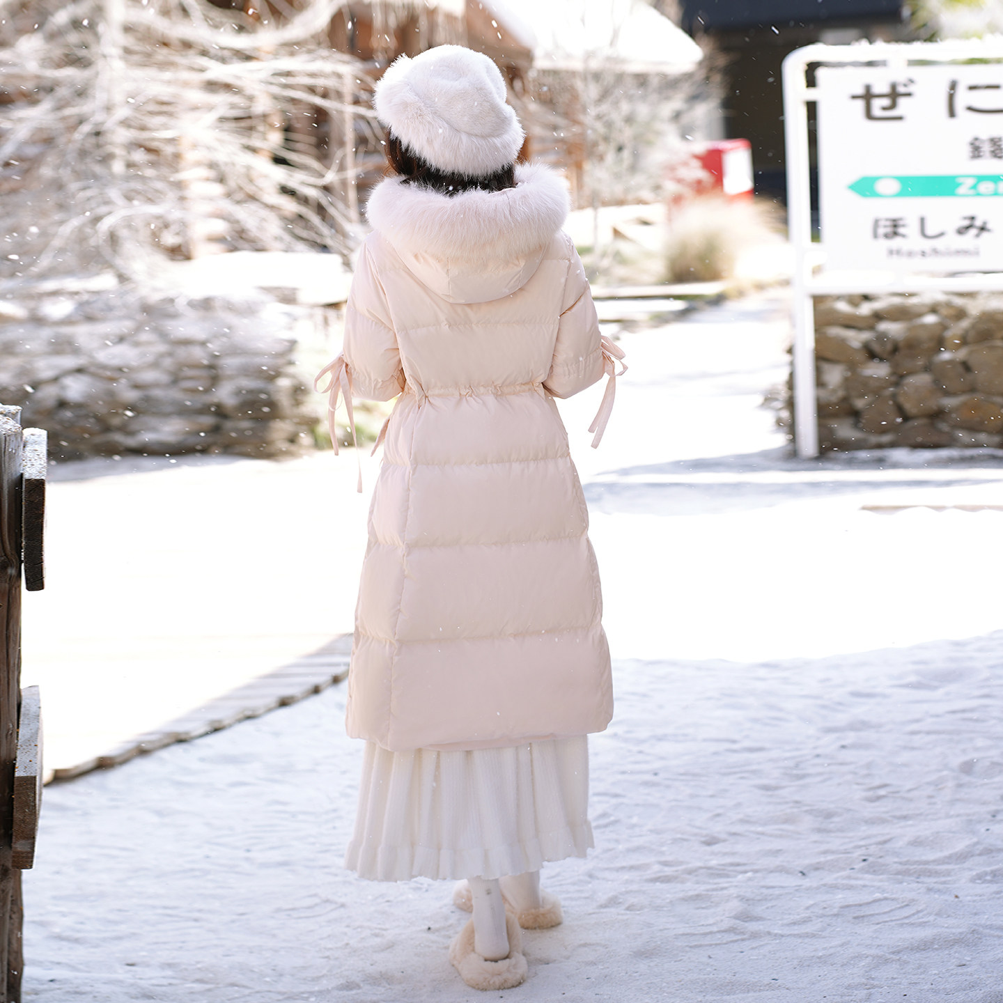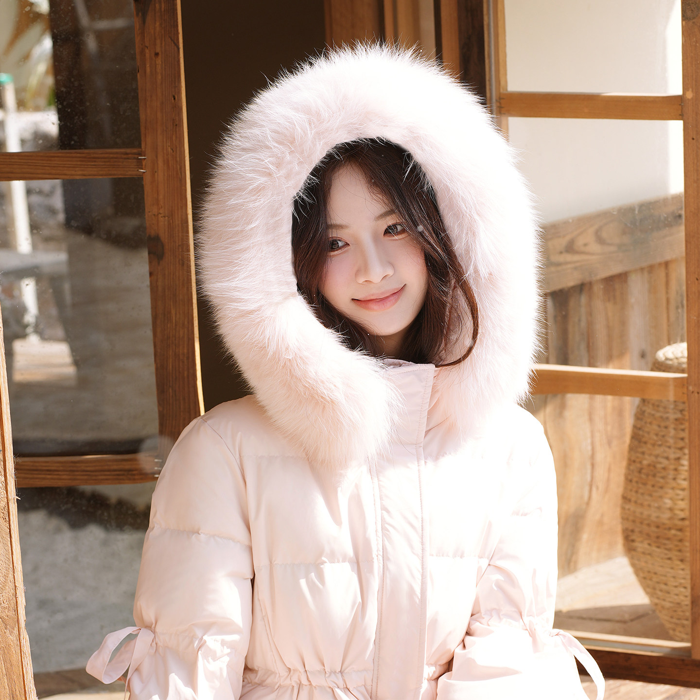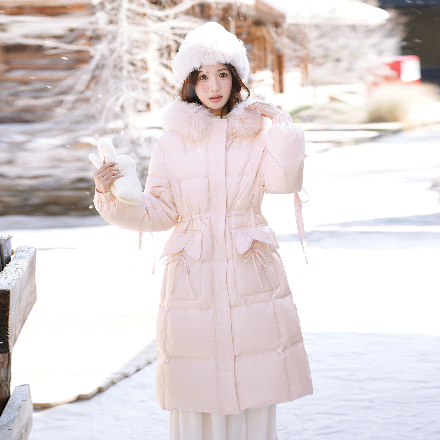 📚 ATAR甜美淑女冬装狐狸毛领连帽羽绒服 蝴蝶结绑带中长款收腰外套
