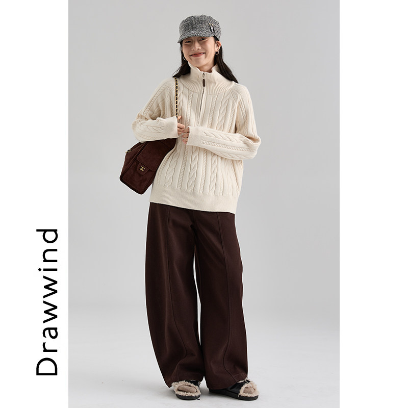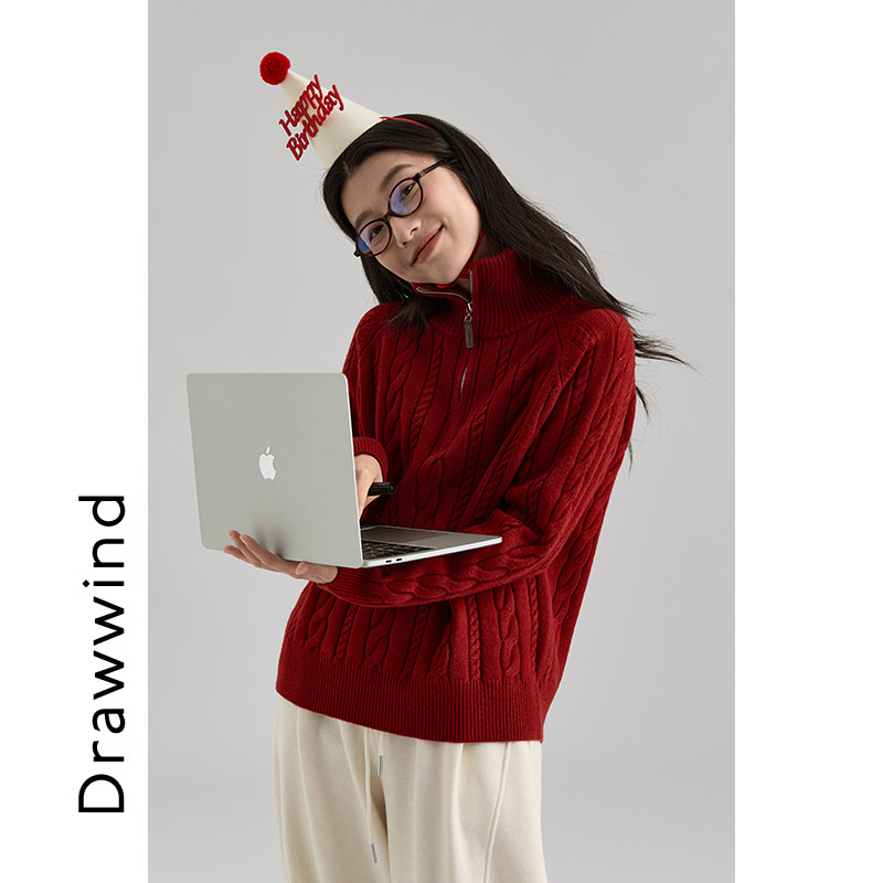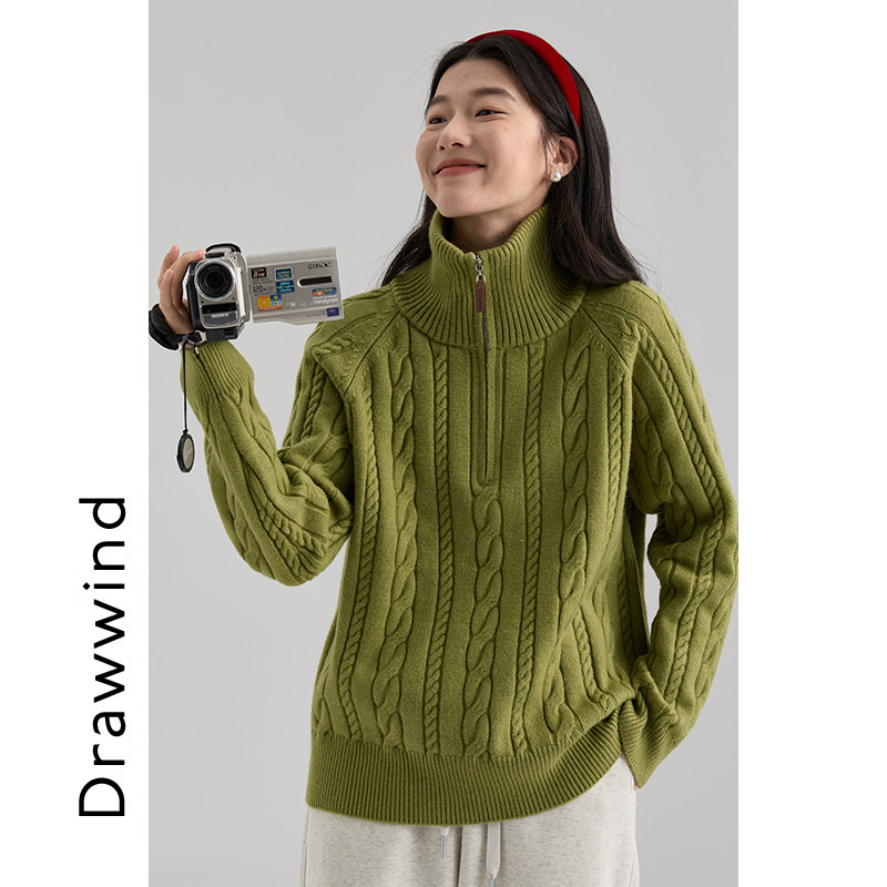 📚 画风drawwind2025新款半拉链套头毛衣女冬宽松立领百搭绞花针织衫