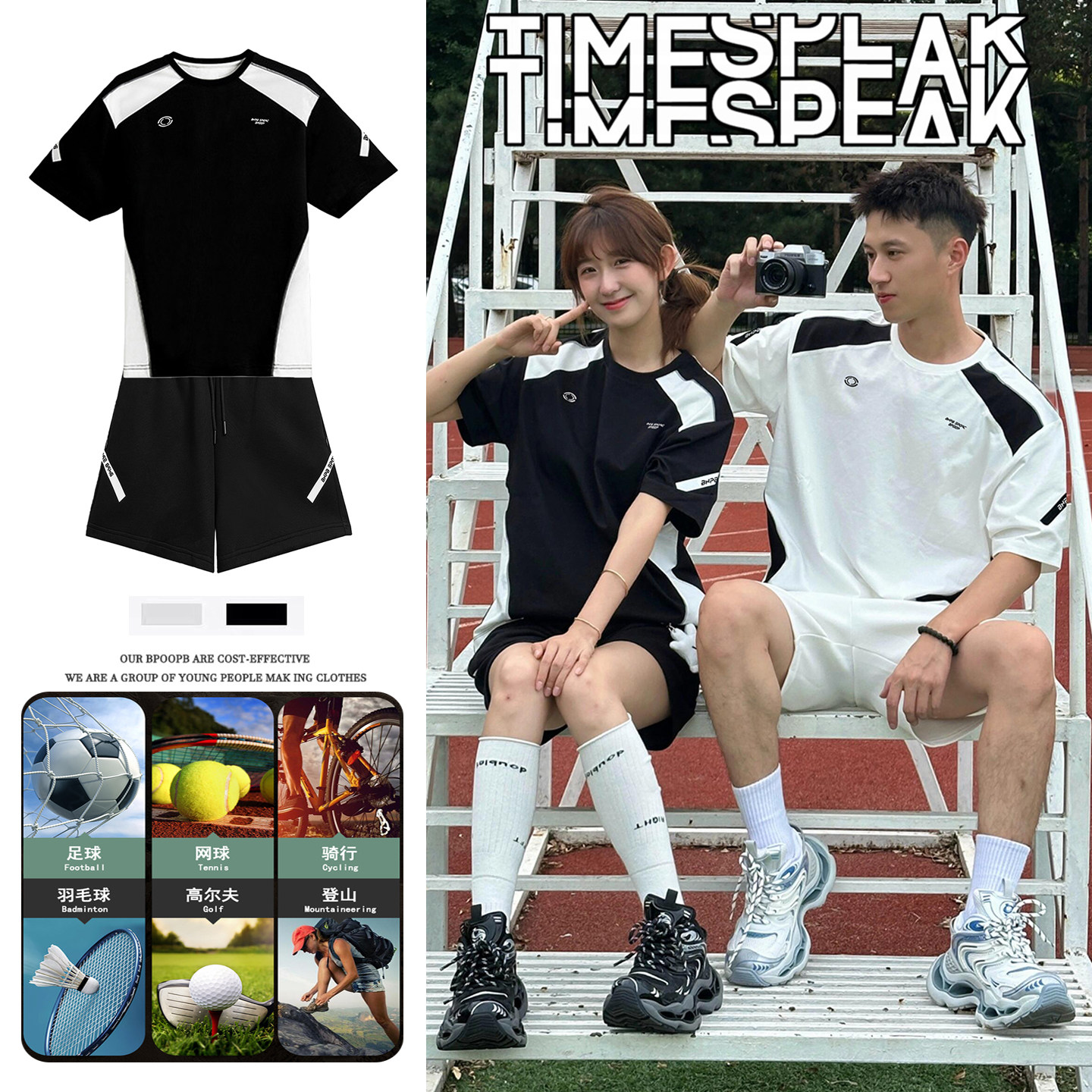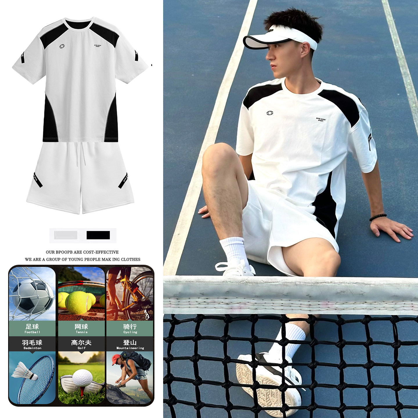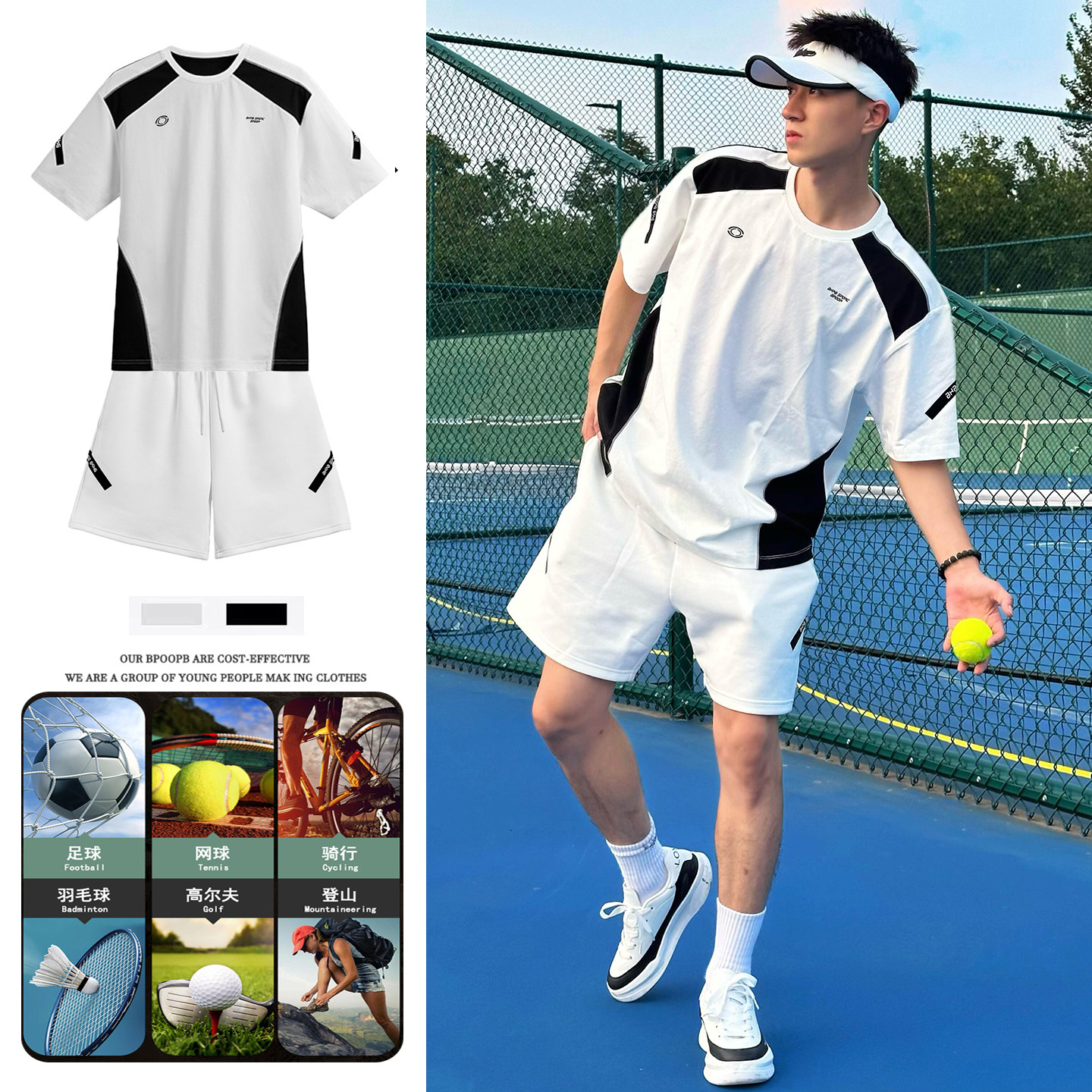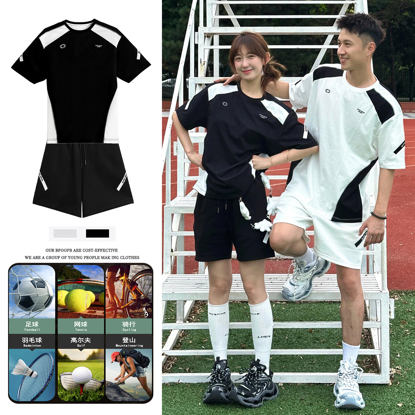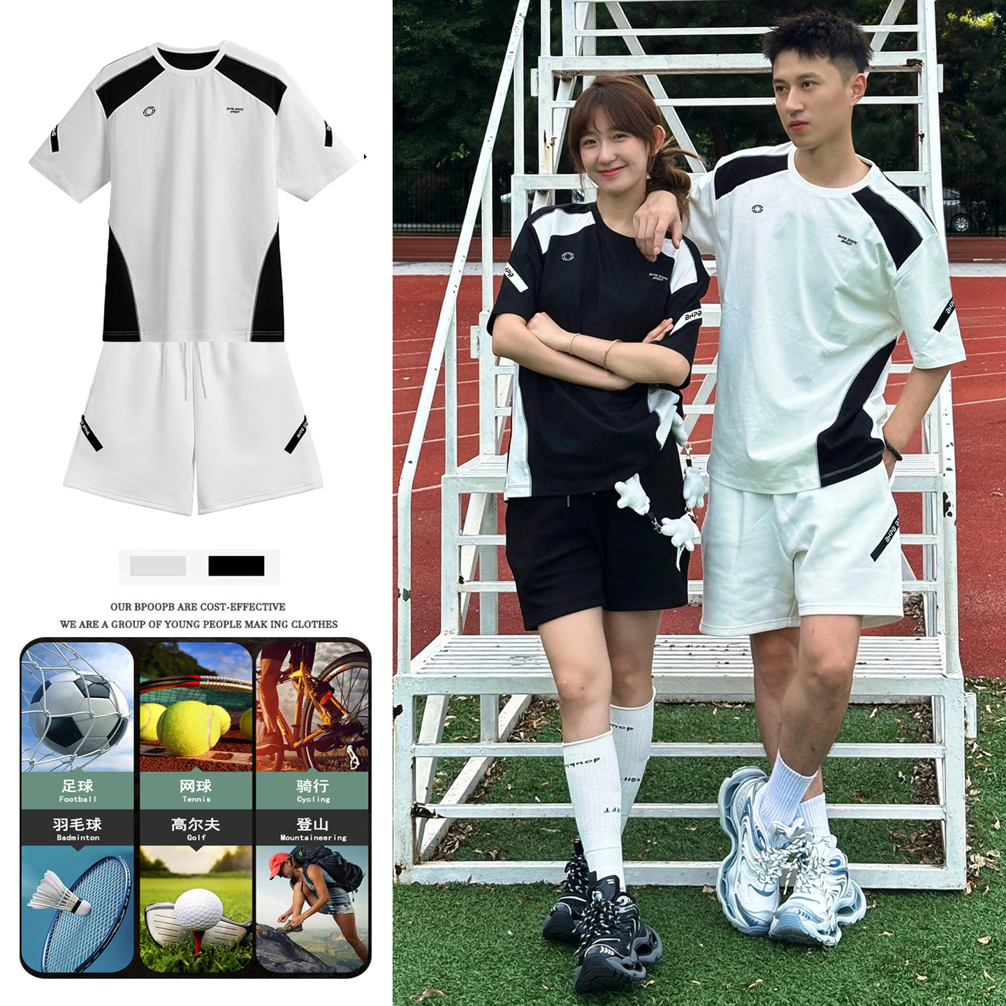 📚 黑白撞色运动套装男女夏短袖短裤宽松速干网球羽毛骑行足球服情侣