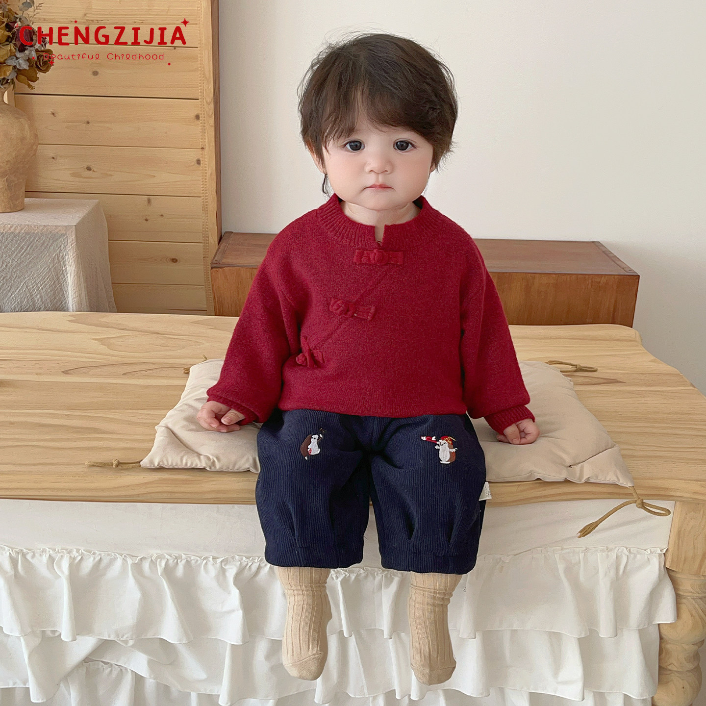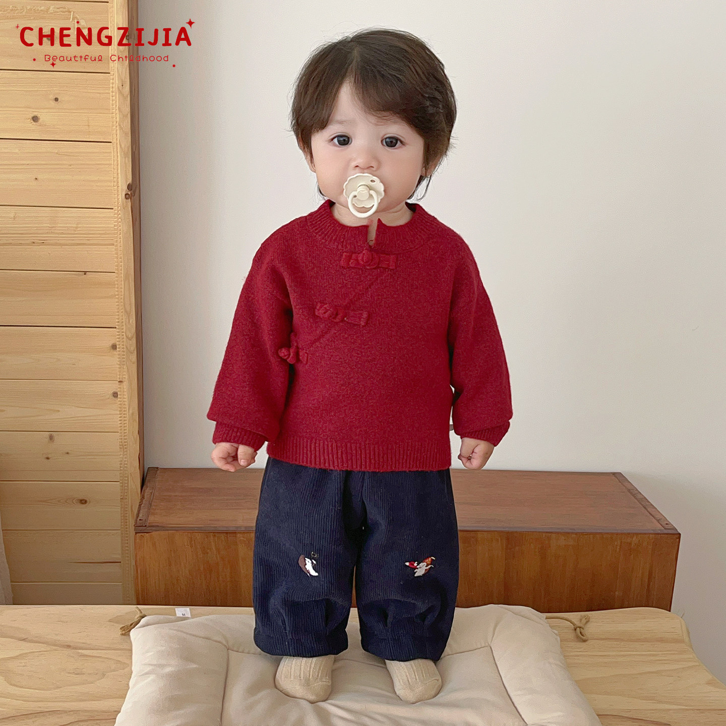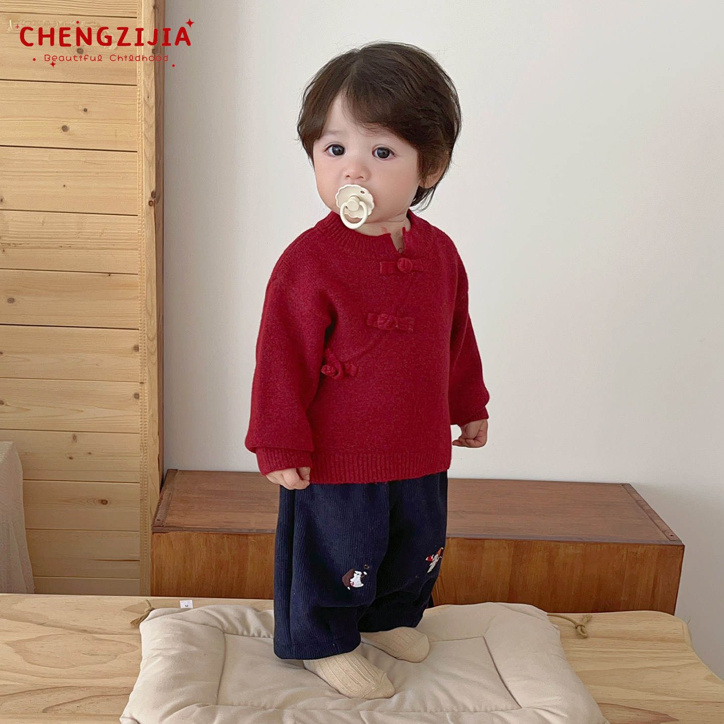 📚 男童冬款立领上衣套装宝宝新年红色加厚保暖针织毛衣婴儿加绒裤子