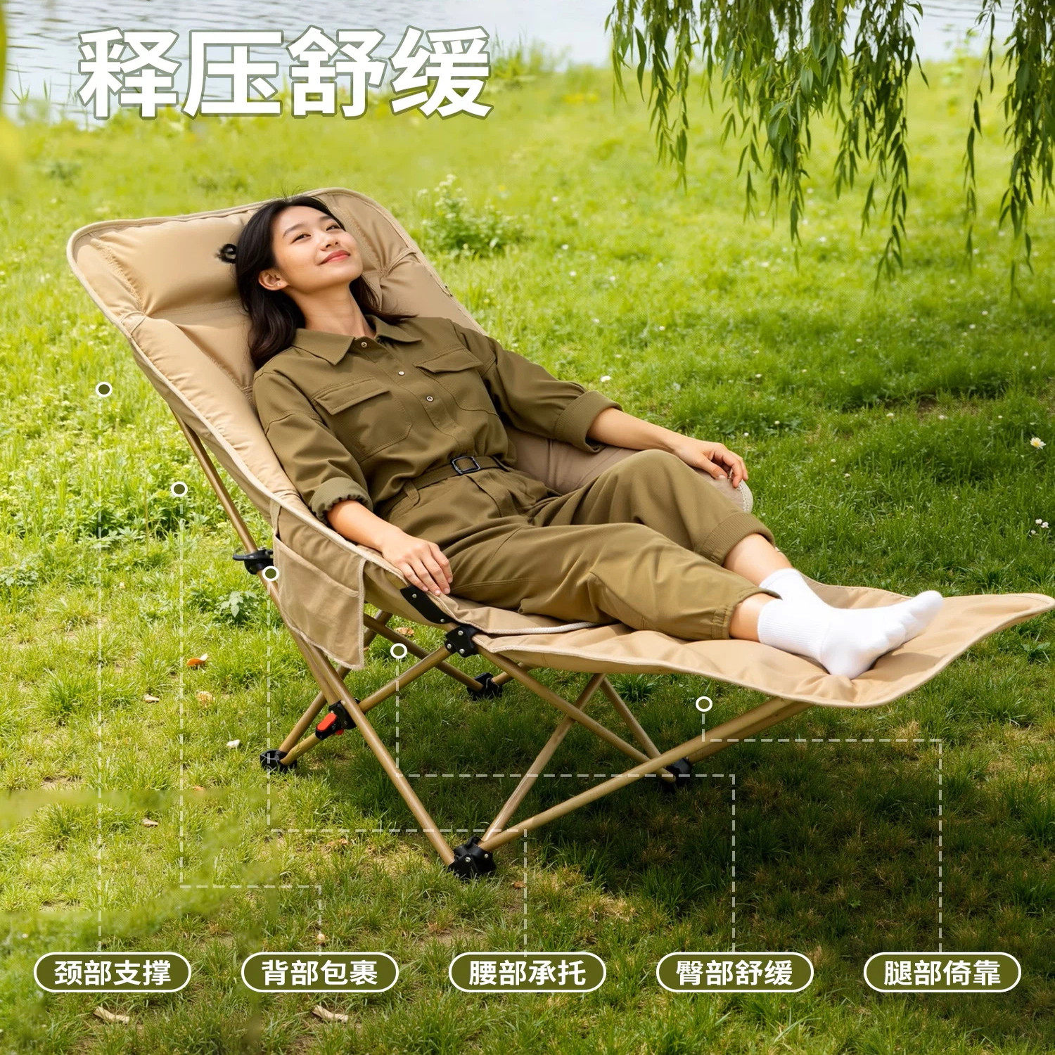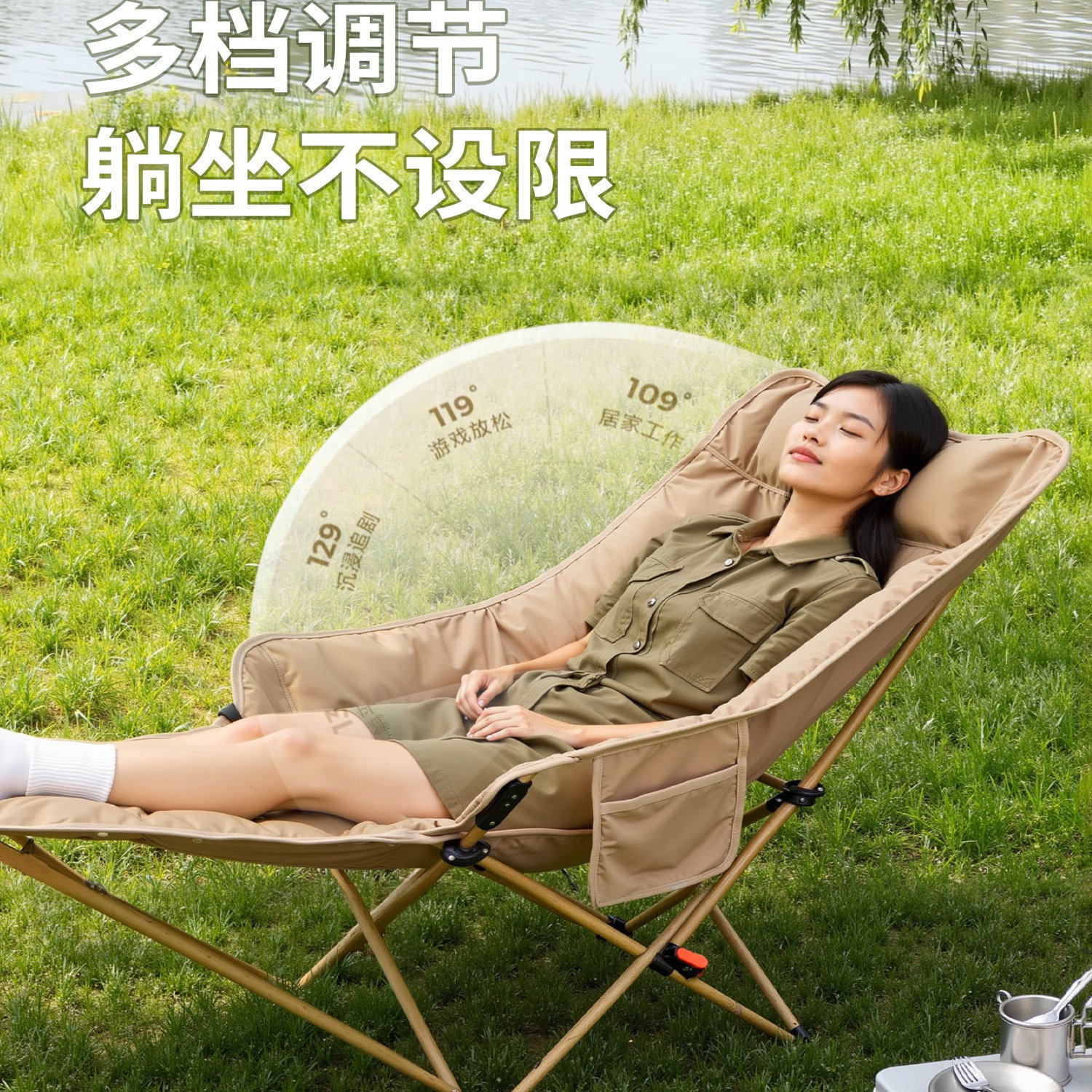 📚 户外可调节折叠椅子便携式露营可坐可躺午睡躺椅带腿拖月亮椅躺椅