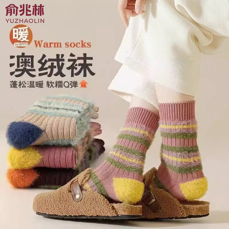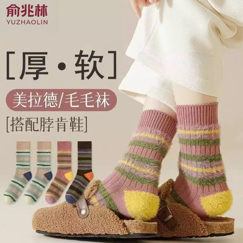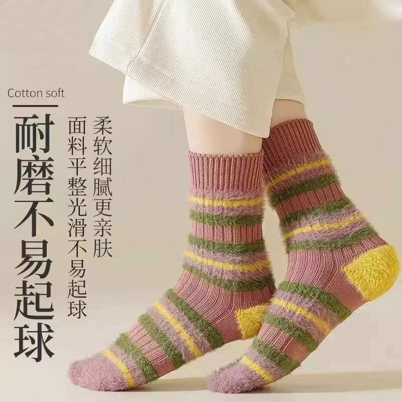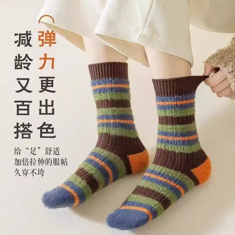 📚 粗线条拼色撞色仿貂ins加厚毛茸茸袜子甜美秋冬季保暖中筒毛绒