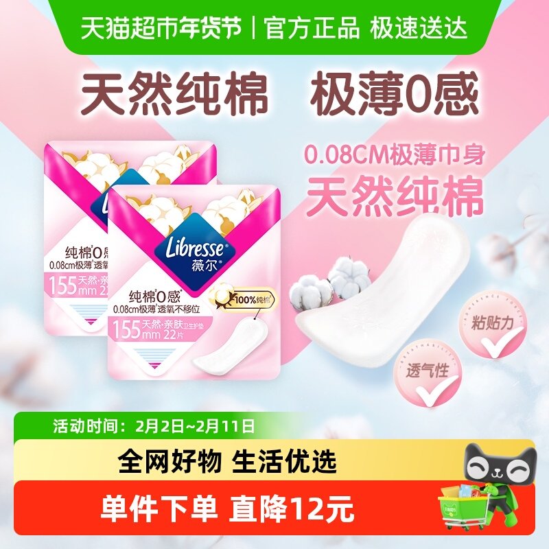 📚 Libresse薇尔纯棉0感极薄纯棉卫生护垫155mm22片*2包【官方正品】
