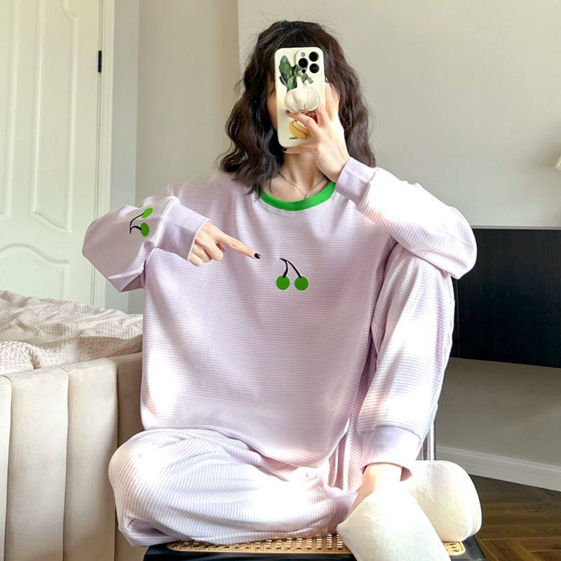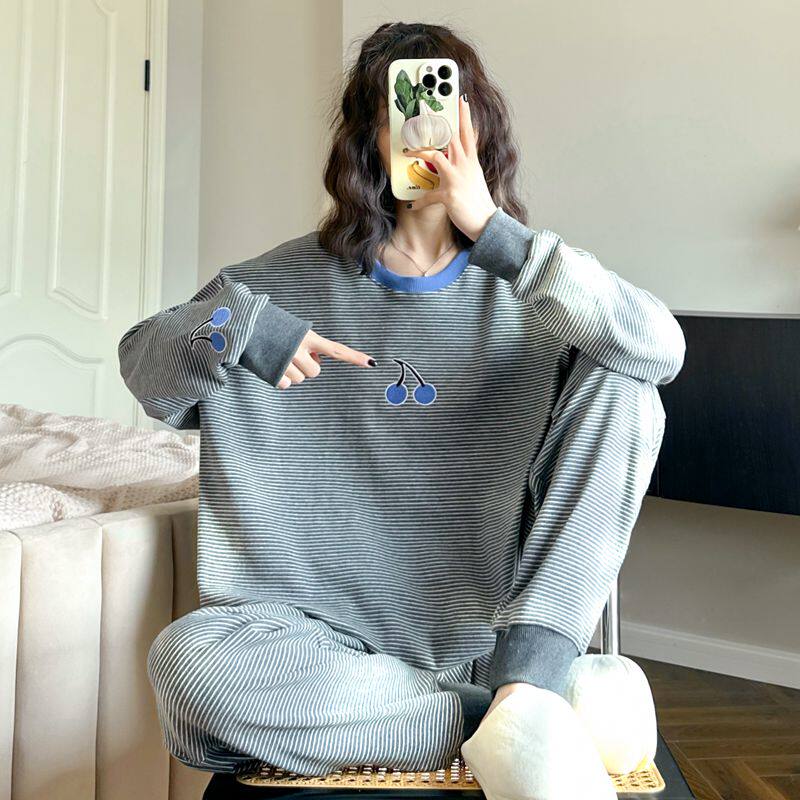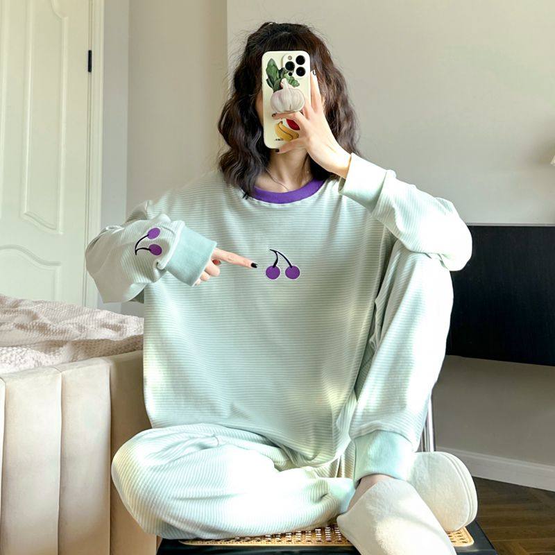 📚 刺绣小樱桃睡衣女春秋季纯棉长袖长裤套装圆领套头休闲宽松家居服