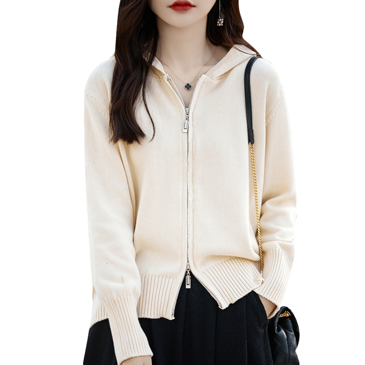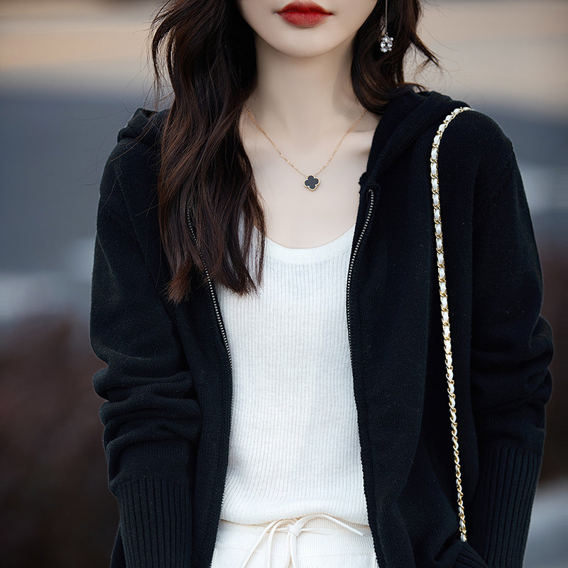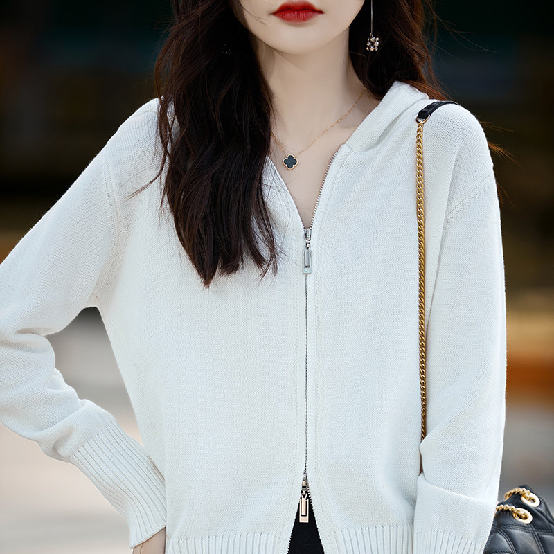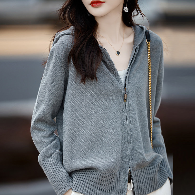 📚 100%纯棉线连帽开衫女双拉链宽松全棉厚款针织毛衣不起球秋季外套