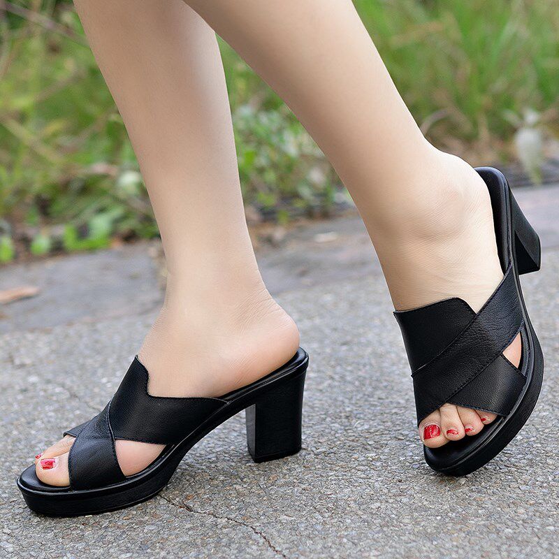 📚 2024夏新款中年真皮凉拖鞋女士高跟妈妈拖鞋粗跟外穿时尚防滑皮托