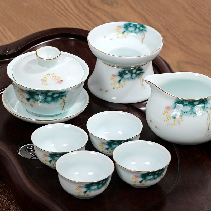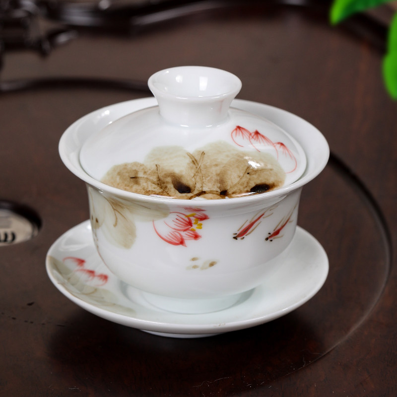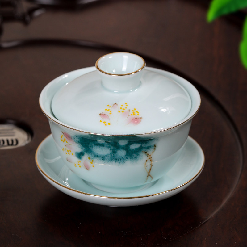 📚 中式国风高档陶瓷盖碗釉中下彩手绘描金梅莲荷鱼青花工夫茶三才碗