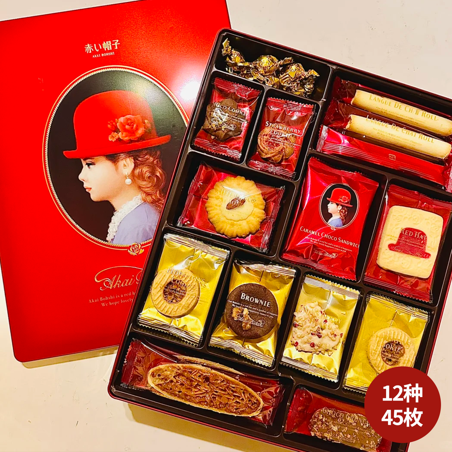📚 日本原装进口红帽子曲奇饼干巧克力新年伴手礼物盒45枚装点心零食