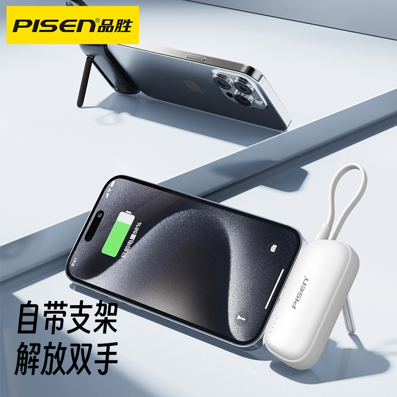 📚 【3C认证充电宝】品胜胶囊充电宝小巧迷你4500毫安15W快充自带支架type线适用华为苹果17/16手机尾插移动电源