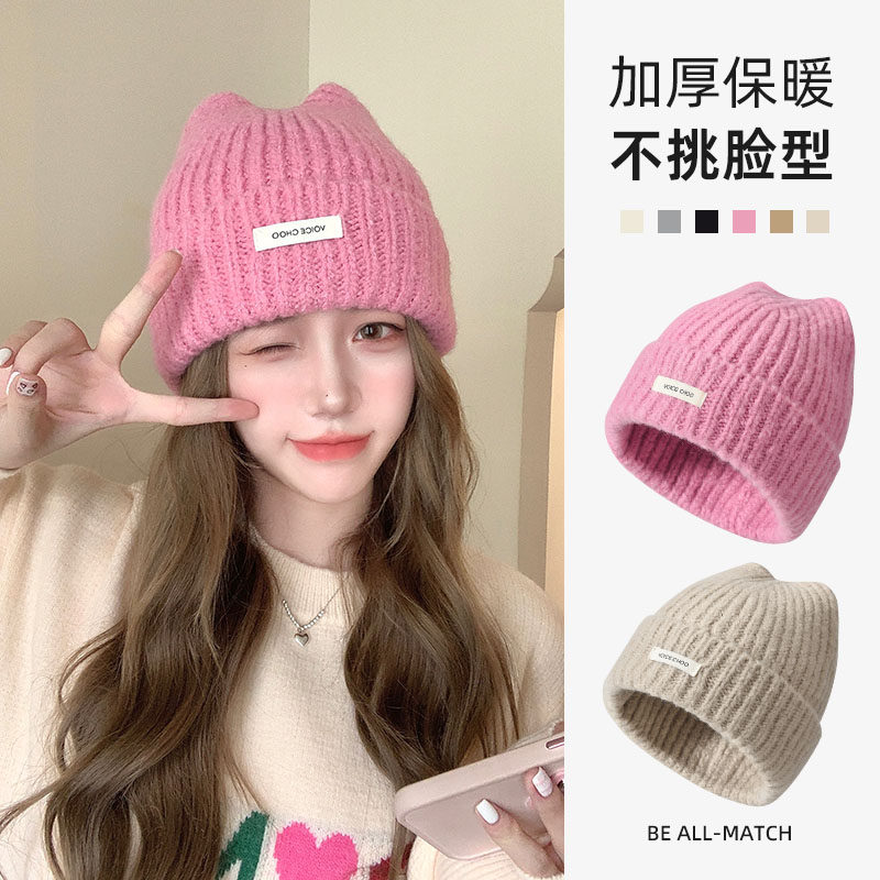📚 猫耳朵毛线帽女秋冬季保暖粉色护耳针织帽2026新款月子包头堆堆帽