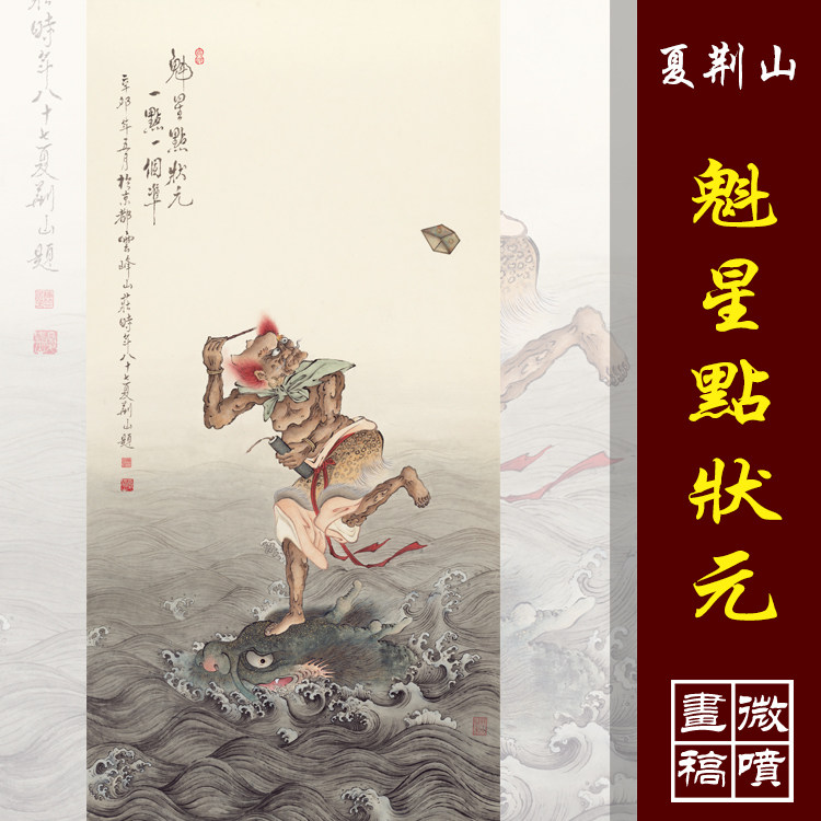📚 夏荆山魁星点状元魁星点斗魁星画像高清国画彩色临摹画稿微喷绢布