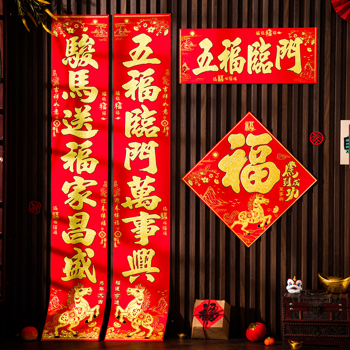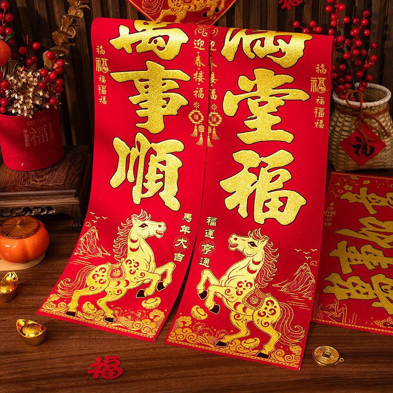 📚 对联2026马年新款春节新年装饰过年福字门贴大门自粘绒布春联背胶