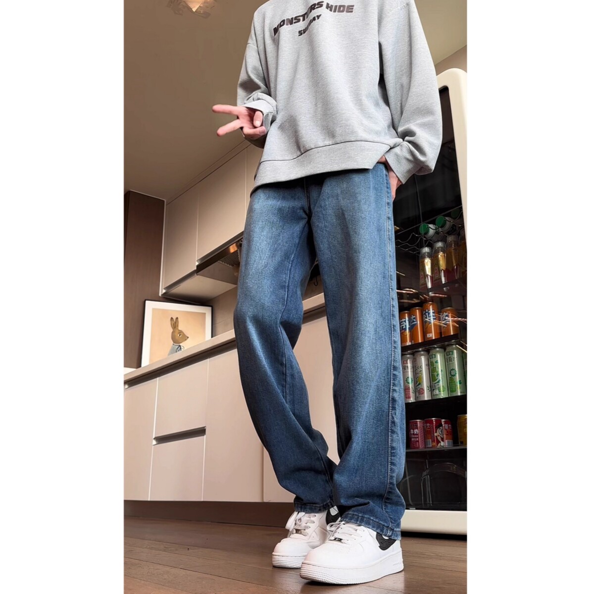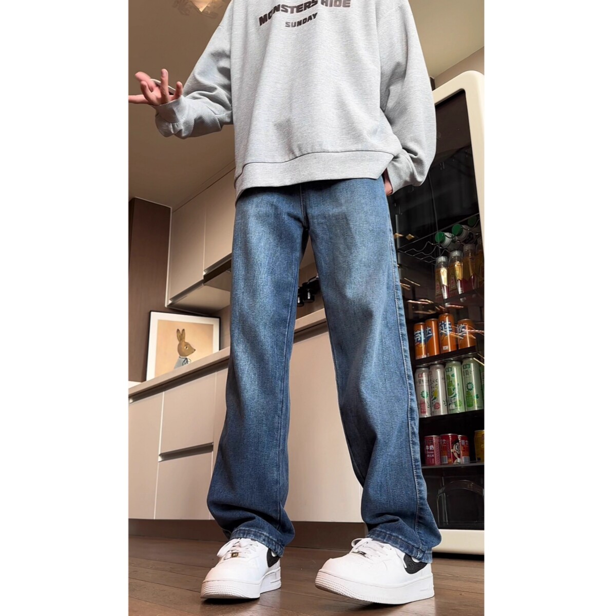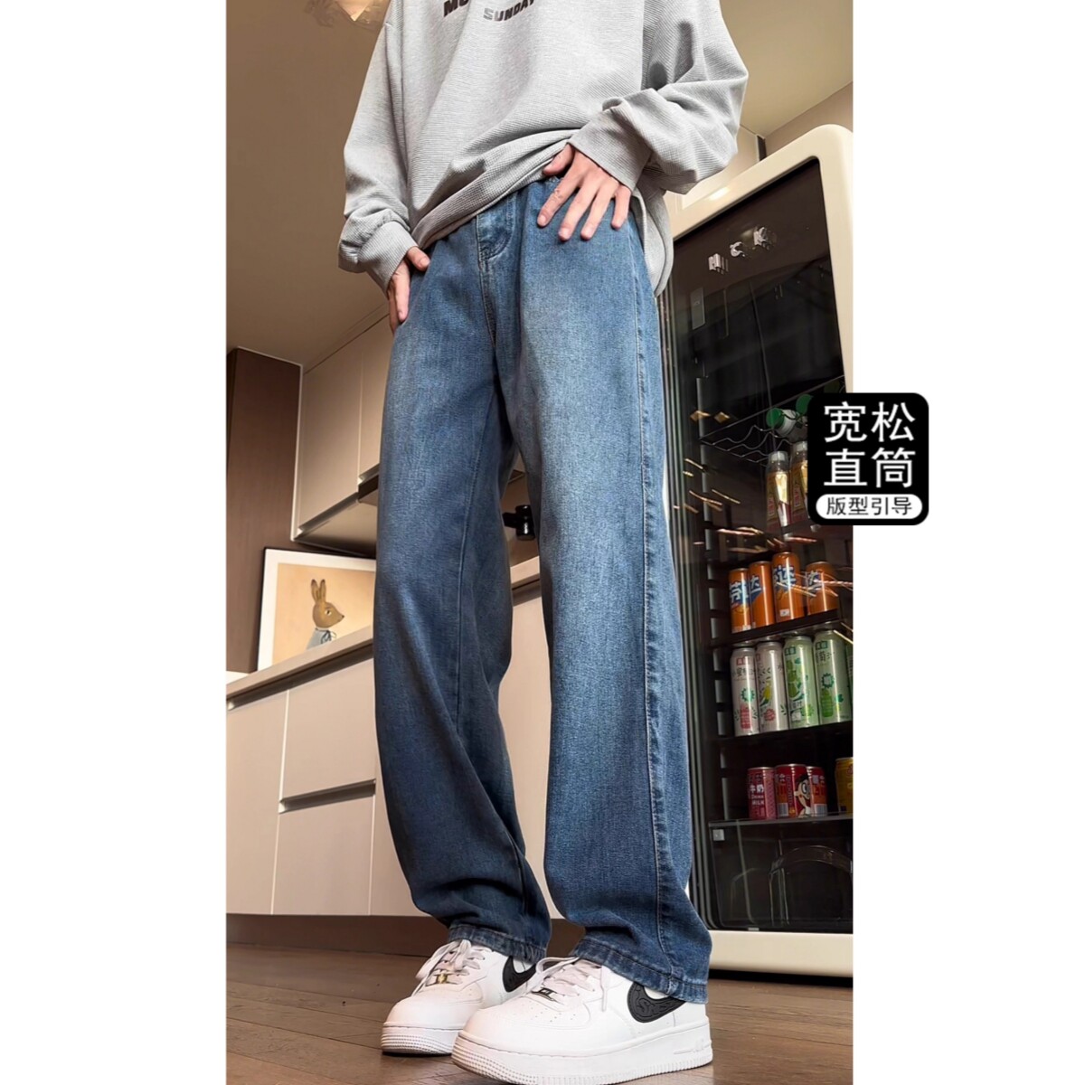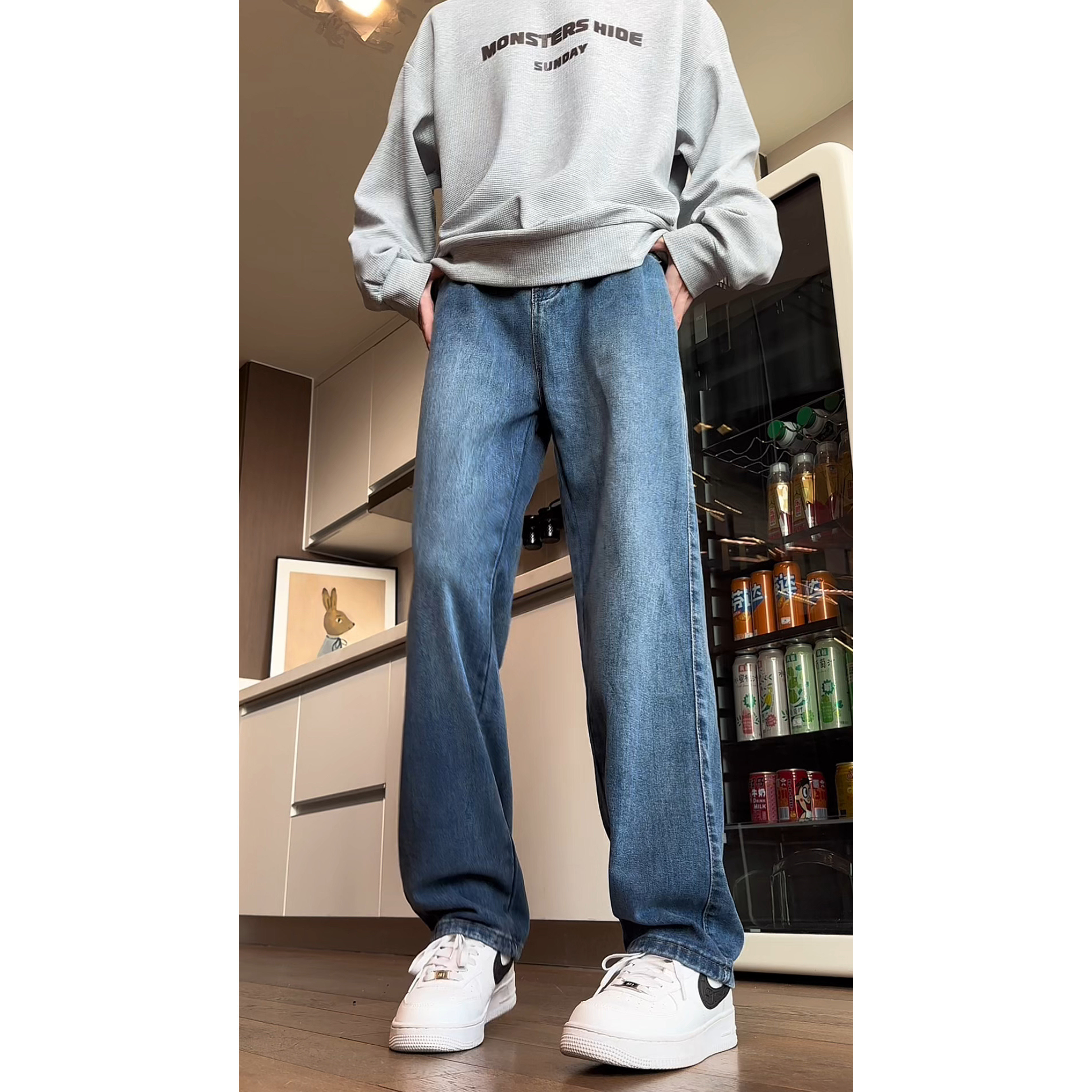 📚 美式水洗复古蓝牛仔裤男潮流宽松直筒长裤高街痞帅松弛垂感拖地裤
